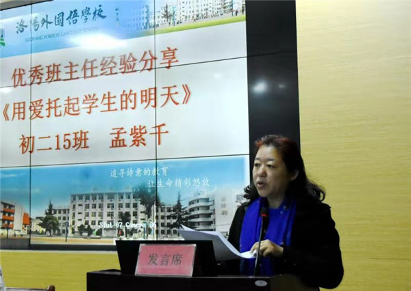 “用爱托起学生的明天”。优秀班主任孟紫千老师从“关爱学生、尊重学生、欣赏学生”“多与家长合作”“善于与任课老师协调沟通”等方面与大家分享了班级管理心得。