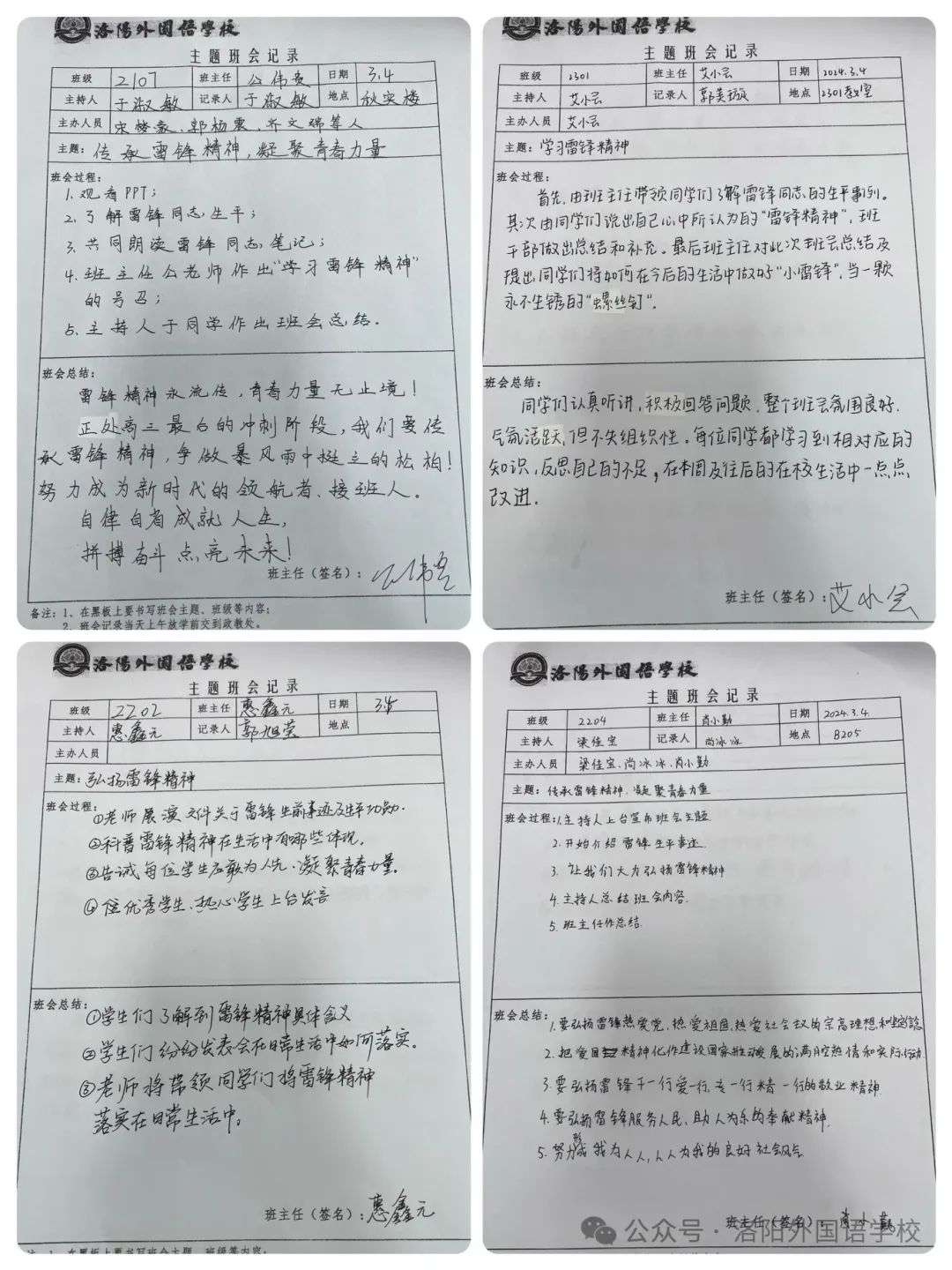 升旗仪式结束以后,各班召开“传承雷锋精神 凝聚青春力量”主题班会,老师们通过讲述雷锋故事、雷锋精神、分享雷锋日记等形式号召学生用实际行动,从身边的小事做起,积极投入到学雷锋活动中去。同学们积极参与,交流对雷锋精神的理解、感悟。大家纷纷表示,要用实际行动践行和传承雷锋精神,积极参与志愿服务,多奉献爱心,传递正能量,弘扬新风尚。主题班会后,各班对主题班会进行详细记录。