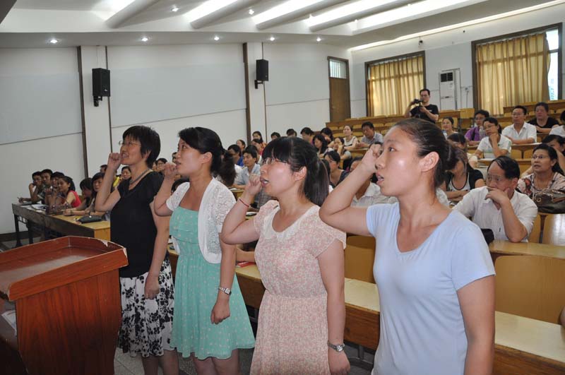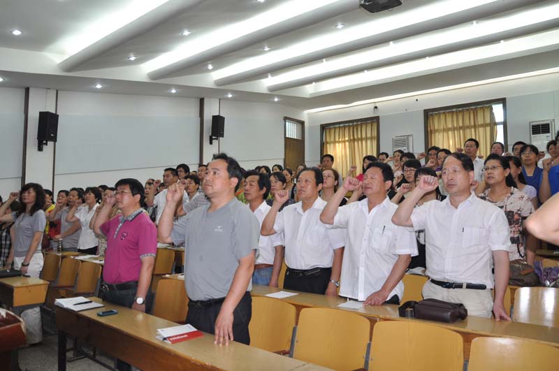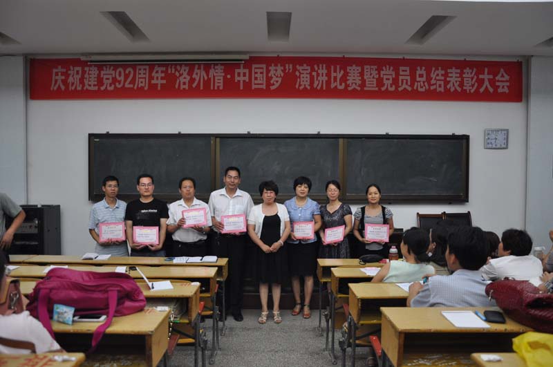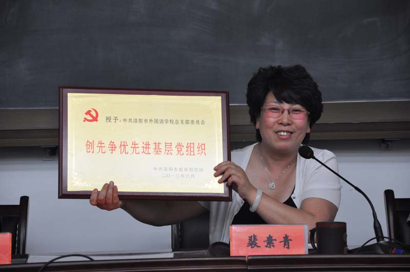 2013年6月28日,洛阳外国语学校举行‘庆祝建党92周年“洛外情▪中国梦”党员总结表彰大会’。全体党员在激昂的国歌声中重温入党誓词,会议表彰了在工作中表现突出的党员同志。