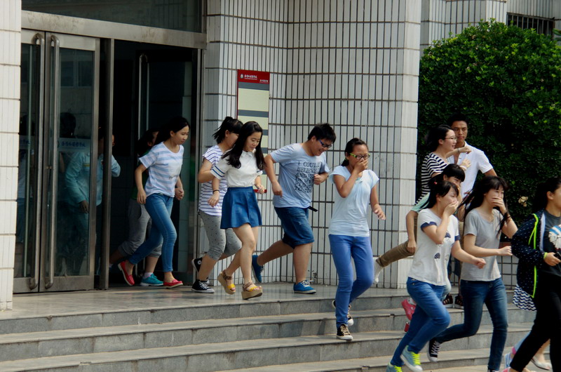 在警报生响起之后,教师指导学生掩住口鼻、弯腰前行、有序撤离。