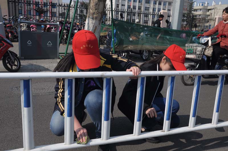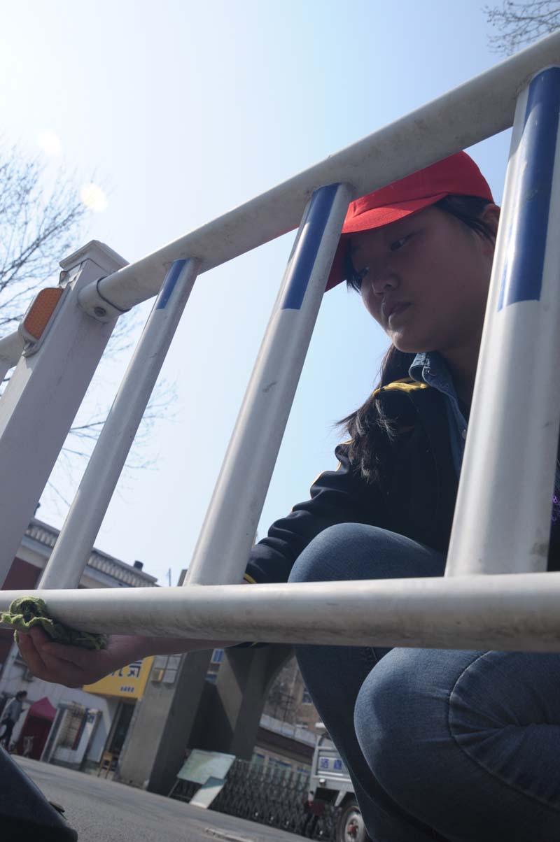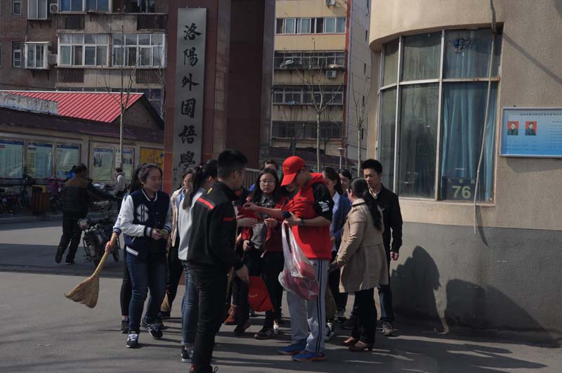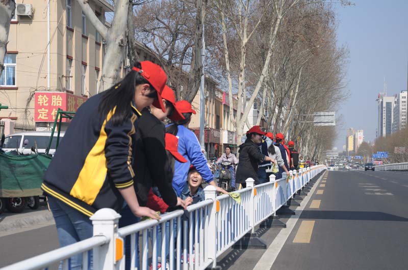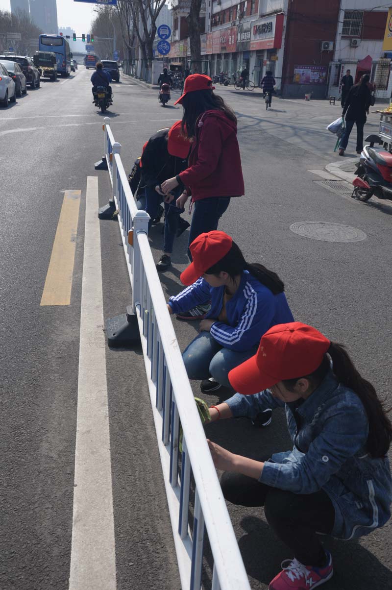 2015年3月27日,太阳拨开云雾露出了笑脸,久违的阳光照耀着大地,洛阳外国语学校高一、9班的小红帽志愿者们在校团委的带领下,积极清理九都路上的行车护栏。同学们认真擦拭着栏杆上的灰尘,美化着我们的城市,用实际行动迎接洛阳牡丹文化艺术节的到来。