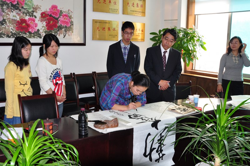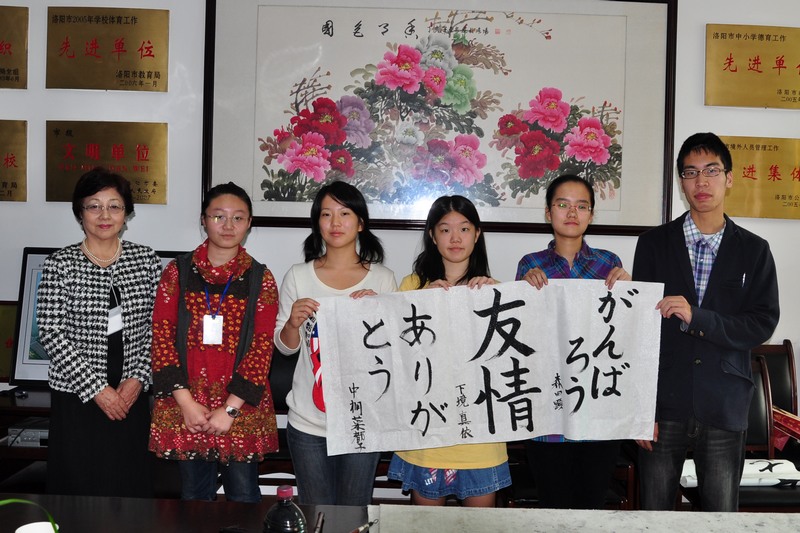 2011年9月23日至27日,日本冈山市后乐馆高中校长及3名学生到我校进行访问交流,中日双方学校进行了亲切友好的交流活动。 上午,洛阳外国语学校裴素青校长接待了日方师生,裴校长对日本客人的到来表示热烈的欢迎,向客人介绍了洛阳外国语学校的基本情况,展示了洛阳外国语学校伊滨校区的发展前景,希望双方在互惠互利的基础上继续开展友好往来,继续加强双方学生和老师的相互交流,继续开拓新的合作交流渠道,增进两校的友谊。会谈结束后,双方学生进行了书法、绘画才艺的表演和交流。
