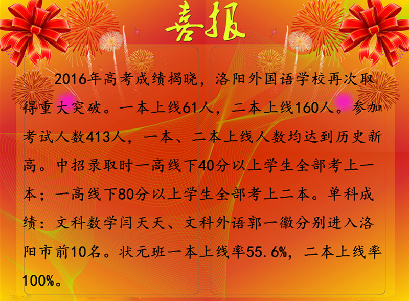 2016年高考成绩揭晓,洛阳外国语学校再次取得重大突破。一本上线61人,二本上线160人。参加考试人数413人,一本、二本上线人数均达到历史新高。中招录取时一高线下40分以上学生全部考上一本;一高线下80分以上学生全部考上二本。单科成绩:文科数学闫天天、文科外语郭一徽分别进入洛阳市前10名。状元班一本上线率55.6%,二本上线率100%。我校部分优生高考成绩:理科:谢家骏640,马雅飞638,王一636,韦猛636,吴怀远632,李晓阳632,杨雅婷628,姚安东615,路仕祺611,宋祥宇610,张天航609,张怡晴605,符世杰604;文科:杨雅雯585,刘雅欣583,曹旭冉579,王一格565,闫天天565,吕浩田564,彭诚563,王清珂561,特向全校师生报喜,向高三年级全体师生表示祝贺。