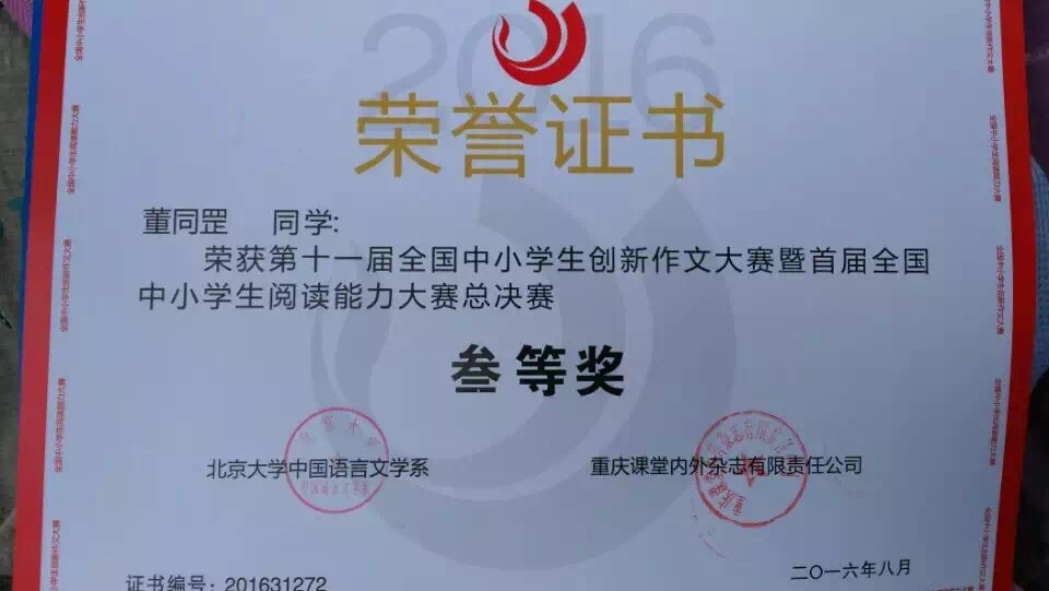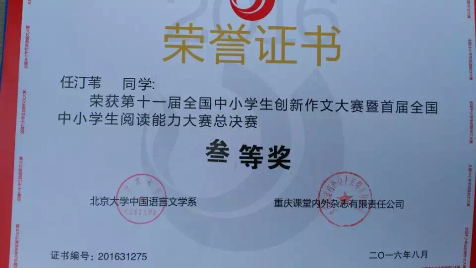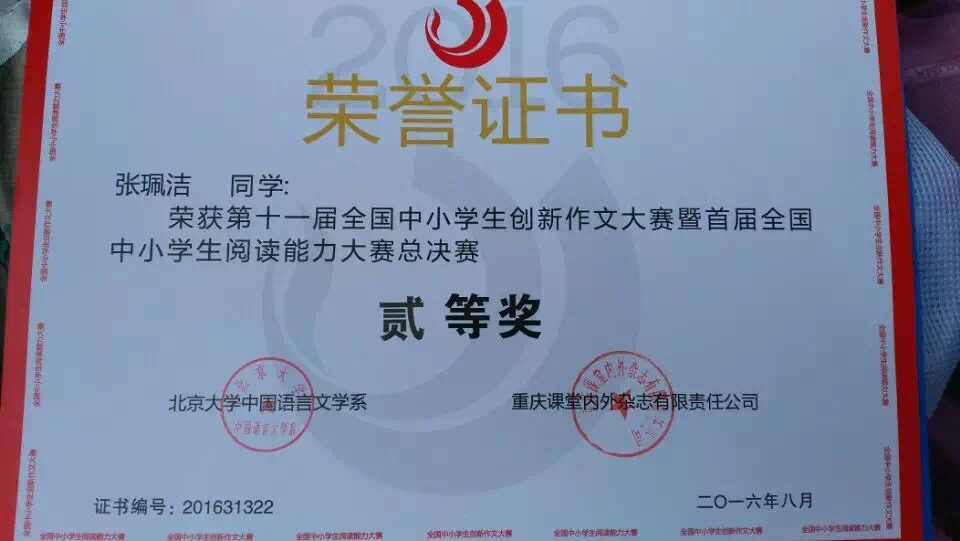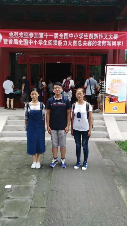 85日参赛师生抵达北京大学。6日上午9点至1130,学生参加比赛。参加此次总决赛的有来自全国各地的1700余名学生。经过两个半小时的紧张写作,学生走出考场。此次大赛作文题目《遇见》,命题质朴,贴近生活,创新的切入点广泛。张珮洁写的是遇见项羽,董同罡写的是遇见川端康成。下午学生参加了北京大学组织的高考志愿填报报告会。7日上午在北京大学百年纪念讲堂举行了自主招生报告会,北京大学、北京师范大学、南京大学、天津大学、山东大学、武汉大学、北京航天航空大学、同济大学等10余所大学做了报告。1030颁奖典礼隆重举行。颁奖嘉宾有著名作家曹文轩、阿来、麦家等。学生们怀着激动地心情等待着幸运女神的眷顾,最终我校三位同学获得了一个二等奖,两个三等奖。