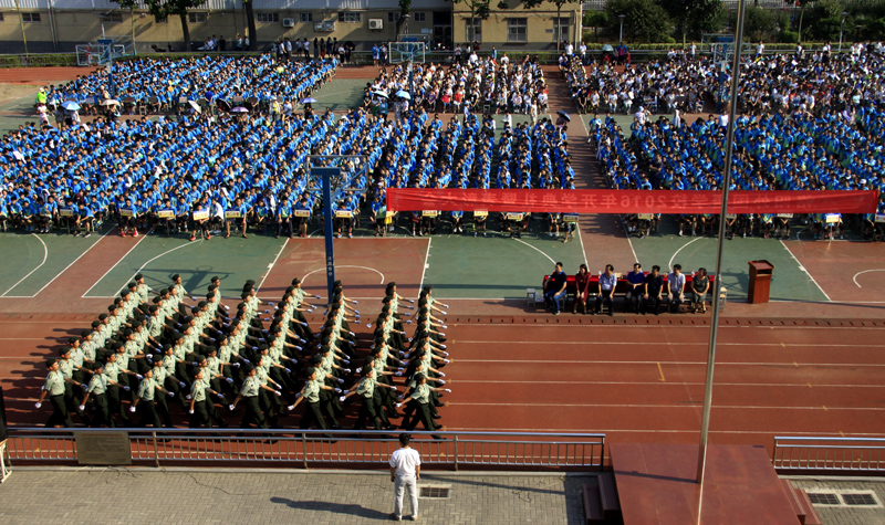 首先由荣获洛阳市军训会操一等奖的洛外高一军训方队为全校5000名师生进行方块队表演,他们精神抖擞意气风发,整齐嘹亮的口号声响彻云霄,充分展示了我校高一新生的昂扬向上的精神风貌。