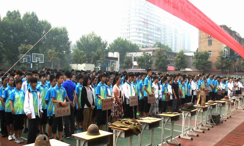 上午10时,两千余名师生来到操场,在凄厉的防空警报声中默哀,之后举行升旗仪式,五星红旗伴着雄壮的国歌声冉冉升起。团市委副县级调研员周志明在给同学们的讲话中指出,九一八不仅仅是东北的耻辱,更是全国的耻辱,这是中国深重灾难的开始,使同学们深入了解那段刻骨铭心的历史并从中从汲取向上的力量。