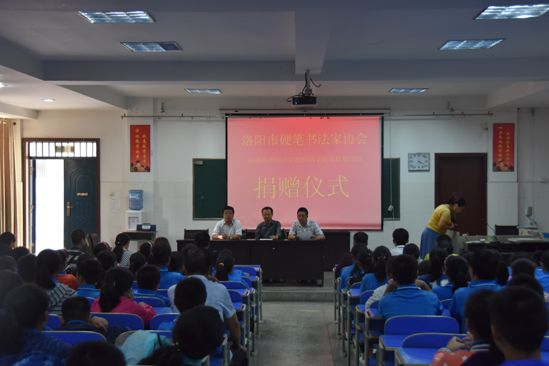 书法教育自古就是传统文化教育中不可或缺的一部分,为了提高学生学习书法的兴趣,促进师生对书法艺术的认知、理解和传承,激发学生参与书法大赛的兴趣,洛阳市硬笔书法家协会于2016年9月19日向洛阳外国语学校师生捐助了字帖及比赛用纸。洛阳市硬笔书法家协会副秘书长王大伟先生,外国语学校副校长胡伟民,校长助理吴进洲,市硬笔书法家协会办公室主任陈新建老师,洛阳硬笔书法家协会培训中心的老师以及我校初一年级师生参加了捐赠仪式。