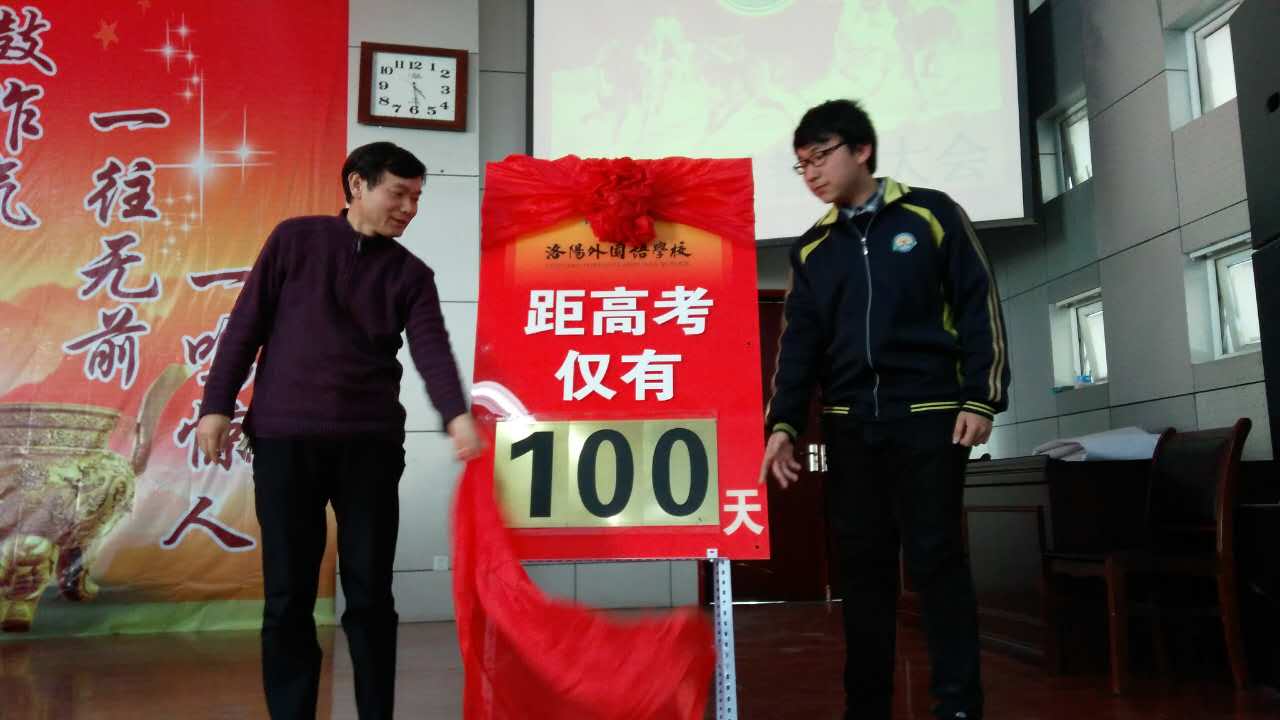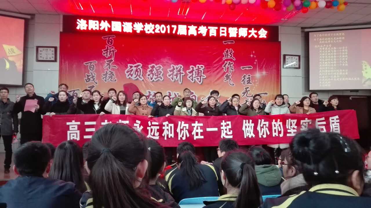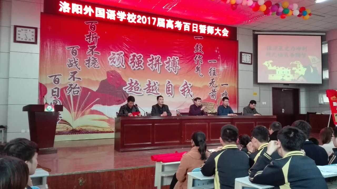 2017224日下午4:20,洛阳外国语学校2017届高三年级“冲刺高考百日誓师大会”在科技楼隆重举行。大会由政教处胡光辉主任主持。与会的校领导有段华松校长、王定国副校长、王建国主任,参加会议的还有高三年级全体师生和学生家长代表。