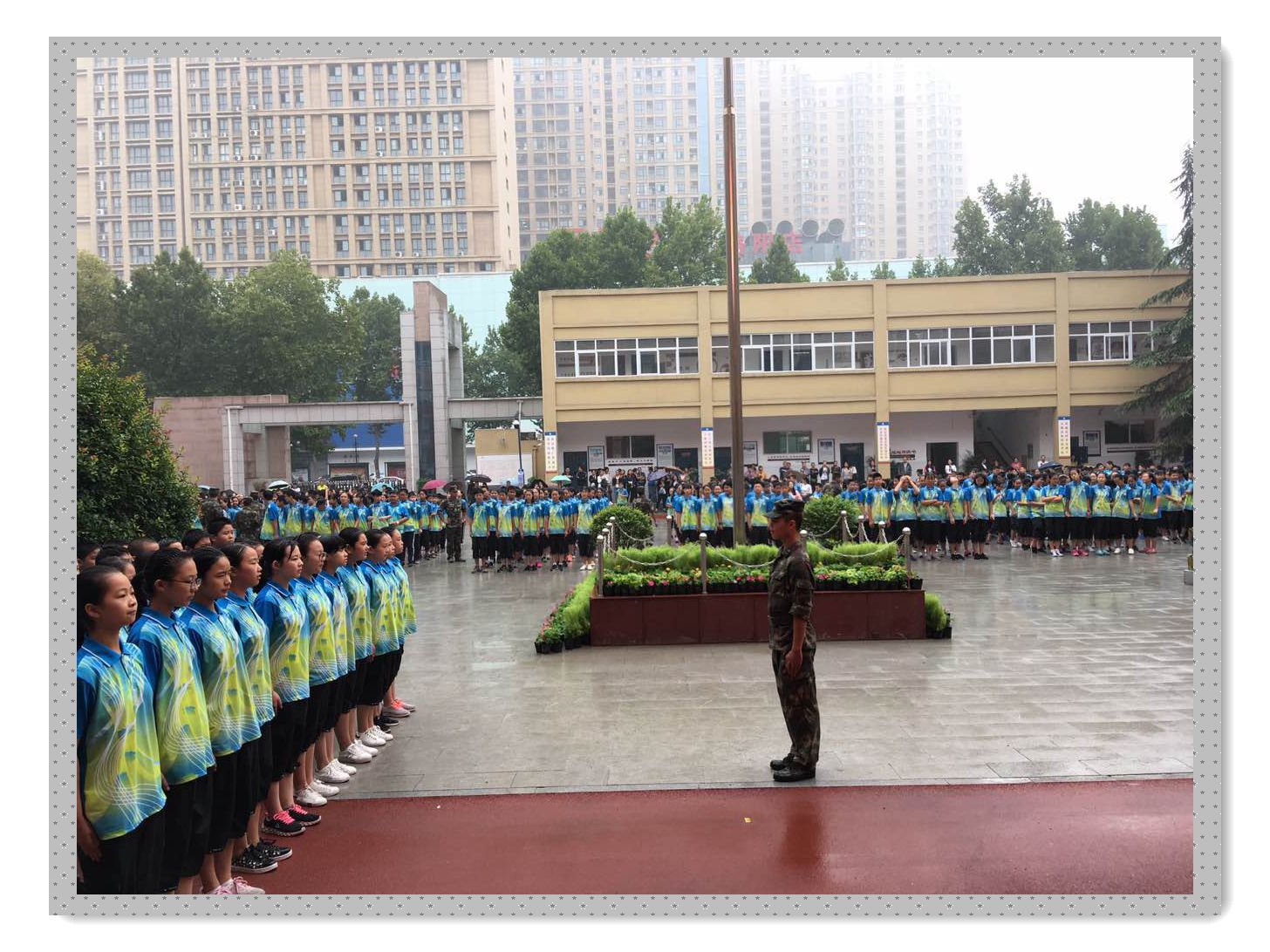 天公不作美,从早上开始,洛阳城就淅淅沥沥的下起了雨。学生们和往常一样早早的来到学校,整齐的列队等待教官开始训练。操场上,放眼望去,雨水和汗水交织在同学们的脸上,共同谱写了洛外拼搏的赞歌。