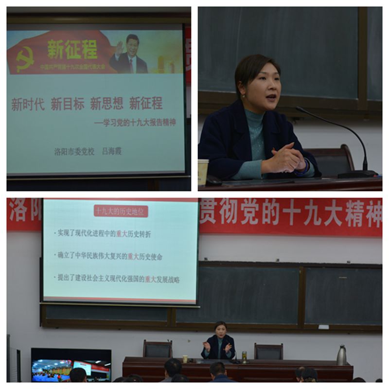我校特邀洛阳市委党校管理教研部副主任吕海霞教授,吕教授以“新时代新目标新思想新征程——学习党的十九大报告精神”为主题,结合自身学习体会和领悟,与我校教师共同分享了学习党的十九大报告的体会,对报告作了透彻的梳理与阐述。随后吕教授带领大家回顾了党十九大报告,深入剖析了十九大报告核心内容,讲解了十九大报告的内涵、历史地位。吕教授通过四个方面深入浅出的讲解,激励了我校广大教师深入学习十九大报告的热情。