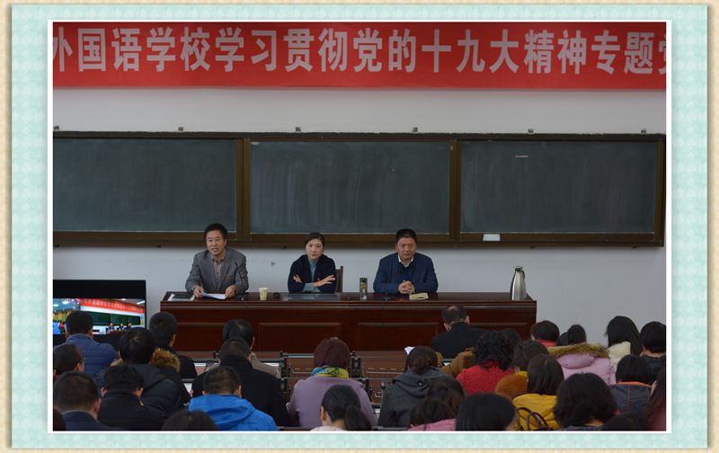 为鼓舞和激励学校党员不忘初心、继续前进,不断提振精神状态,改进工作作风,形成优良的树德立人氛围,洛阳外国语学校党总支于2017年11月20日开展了“学习贯彻党的十九大精神”专题党课,我校全体教师参加了学习。