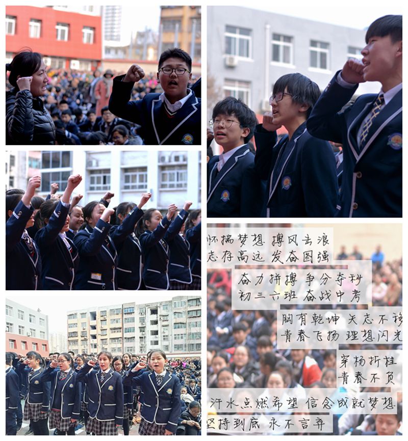 随后誓师大会进入最振奋人心的环节,初三年级18个教学班依次宣誓,“怀揣梦想、搏风击浪;青春飞扬、理想闪光;穿杨折桂、展翅鲲鹏;汗水点燃希望,信念成就梦想……”同学们声音洪亮、铿锵有力,感染着在场的每一个人。