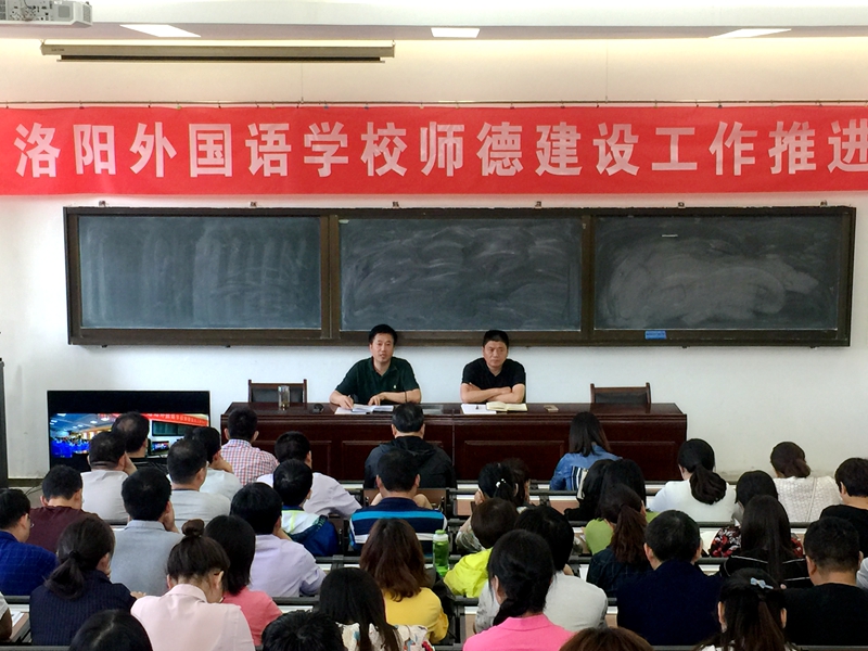为进一步加强学校师德师风建设,强化教师“爱与责任”的意识,提高教师的职业道德素养,规范从教行为,认真贯彻落实洛阳市教育局关于全市中小学师德建设工作推进会精神,洛阳外国语学校于2018年5月3日召开师德建设推进工作会议。