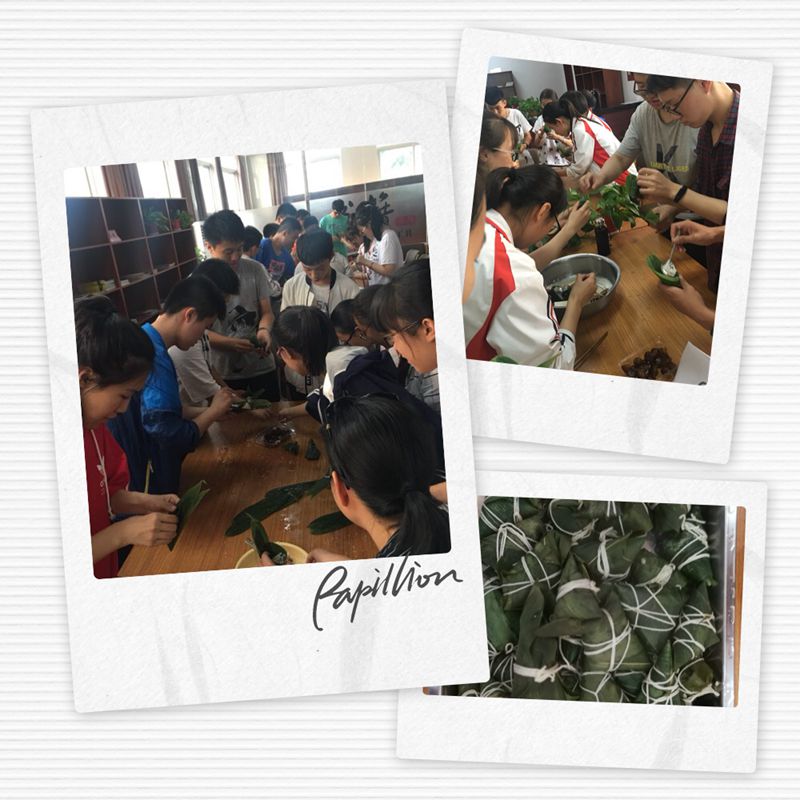高二.4班的同学们在班主任王文婧老师的带领下一起包粽子,共度端午。