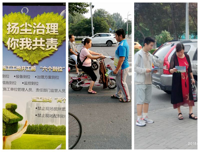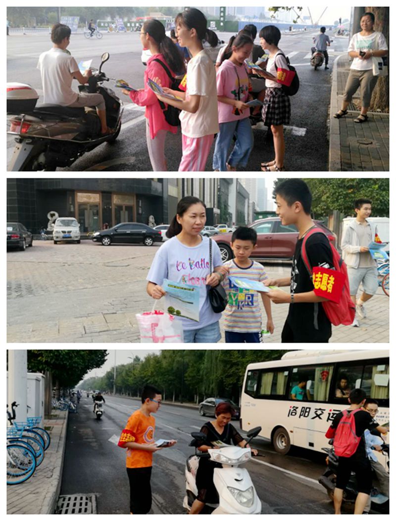“曹涵旸、曹晗悦、薛丝雨、赛若灵等4名女生为一组在王城大道与太康路交叉口;俞沛航、李成、李程翔为第二组在太康路与望春门街交叉口;曹原、穆昊,常秩诚、靳天乐为第三组在太康路与金城寨街交叉口,带上300份洛阳市住房和城乡建设委员会、洛阳市控尘办精心印制的“扬尘治理、你我共责”的公益宣传彩页,分发给过往的群众,40分钟内完成。”组织该项社会实践活动的道德与法制王老师部署学生参与蓝天保卫战的第一项任务。