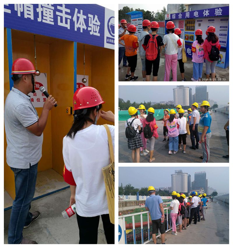 在王城大道改扩建工程腾飞市政项目工地施工现场,参与活动的师生们一起集合在 “让城市生活更美好”的宣传牌下,腾飞市政工程公司项目经理陈富聚给师生们宣传“蓝天保卫战”的重大意义,介绍市政工程做好扬尘治理工作的基本情况。师生们参观了佩戴安全帽防护、安全带防护、安全用电防护、消防防护等展示现场,工地建设者开启了防尘降尘的雾炮机、洒水车、喷淋设施和车辆冲洗台,让师生和家长们现场感受扬尘污染防控的具体措施。参观结束后,师生们纷纷在“守护洛阳蓝我们在行动”的宣讲台前合影留念。