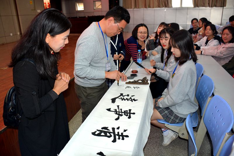 之后,韩国学生与洛外学子在科技楼进行交流。有民族乐器双排萧,地方戏豫剧,吉他及书法展示。韩国师生也跃跃欲试,体验书法,并当场展示作品。随后韩国学生也带来了他们的才艺展示,唱歌和Hangle。