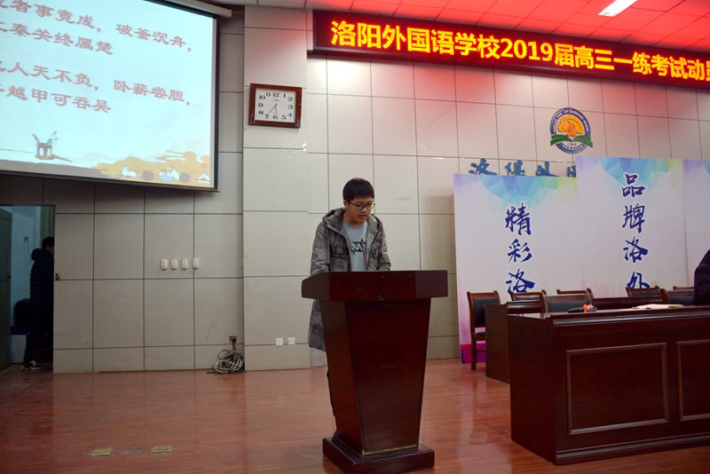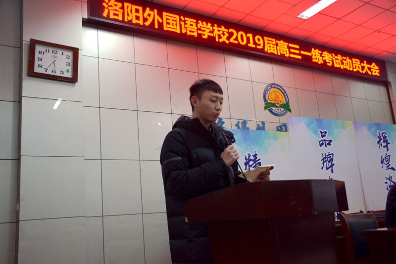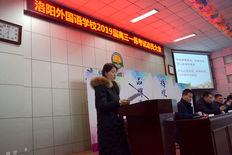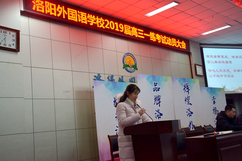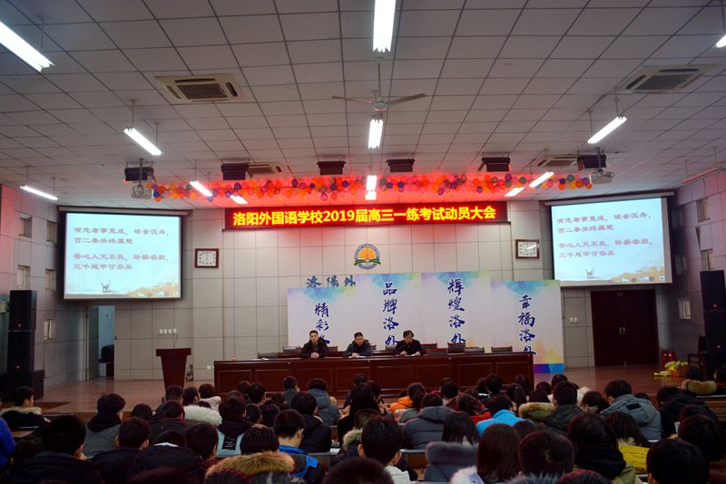 2019年1月9日,洛阳外国语学校举行了高三年级一练动员会,为即将参加全市高三第一次大练兵的学子们加油助威,以饱满的精神应战一练考试。会议由王定国副校长主持,齐振富校长、项伟副校长、王定国副校长,王建国主任参与了本次活动。
