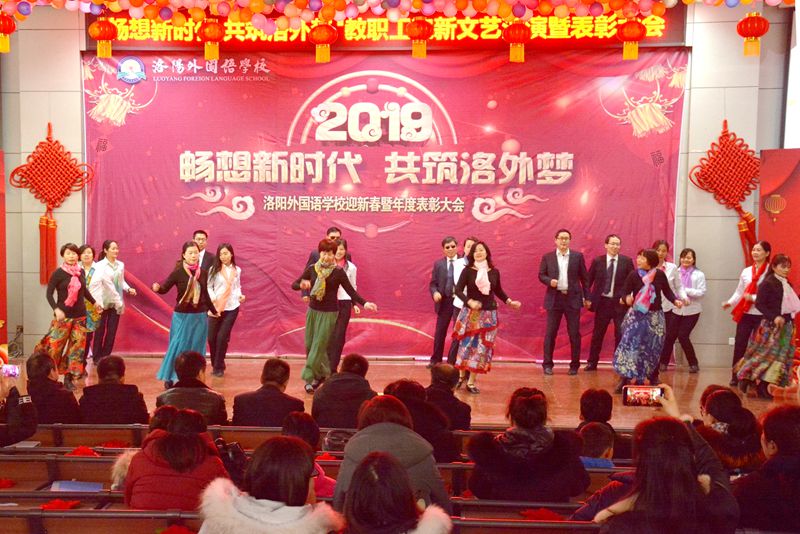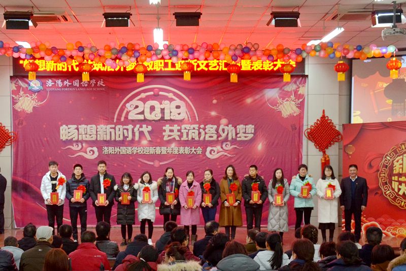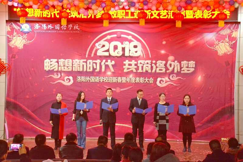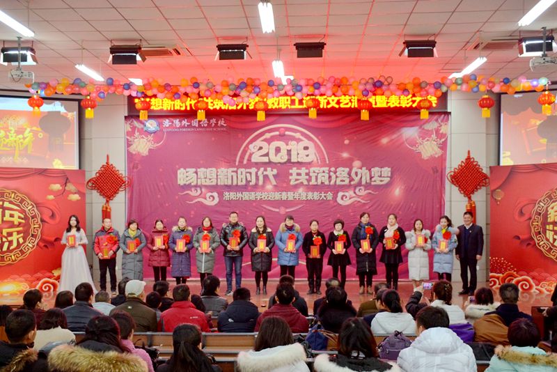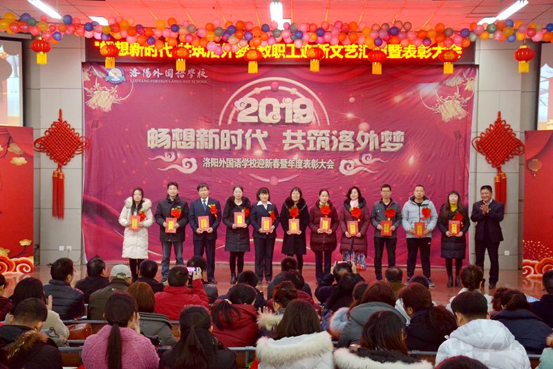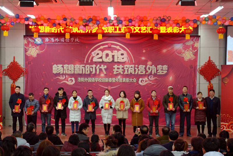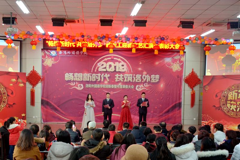 为了在学校树立标杆,弘扬正气,传递正能量,进一步激励全体教师爱校、敬业、勤业、精业,不断推进我校教育事业可持续发展,表达对广大洛外人最诚挚的新春祝福,2019年1月20日上午,洛阳外国语学校举行了“畅想新时代,共筑洛外梦”教职工迎新文艺汇演暨表彰大会,会上表彰了11位2018年度功勋教师以及45位模范工作者,科技楼内流光溢彩、笑语盈盈、暖意融融。