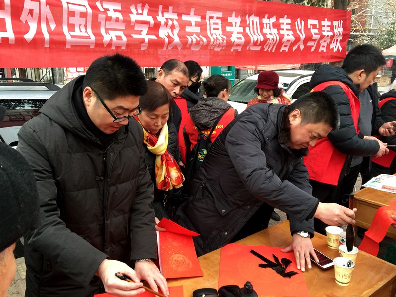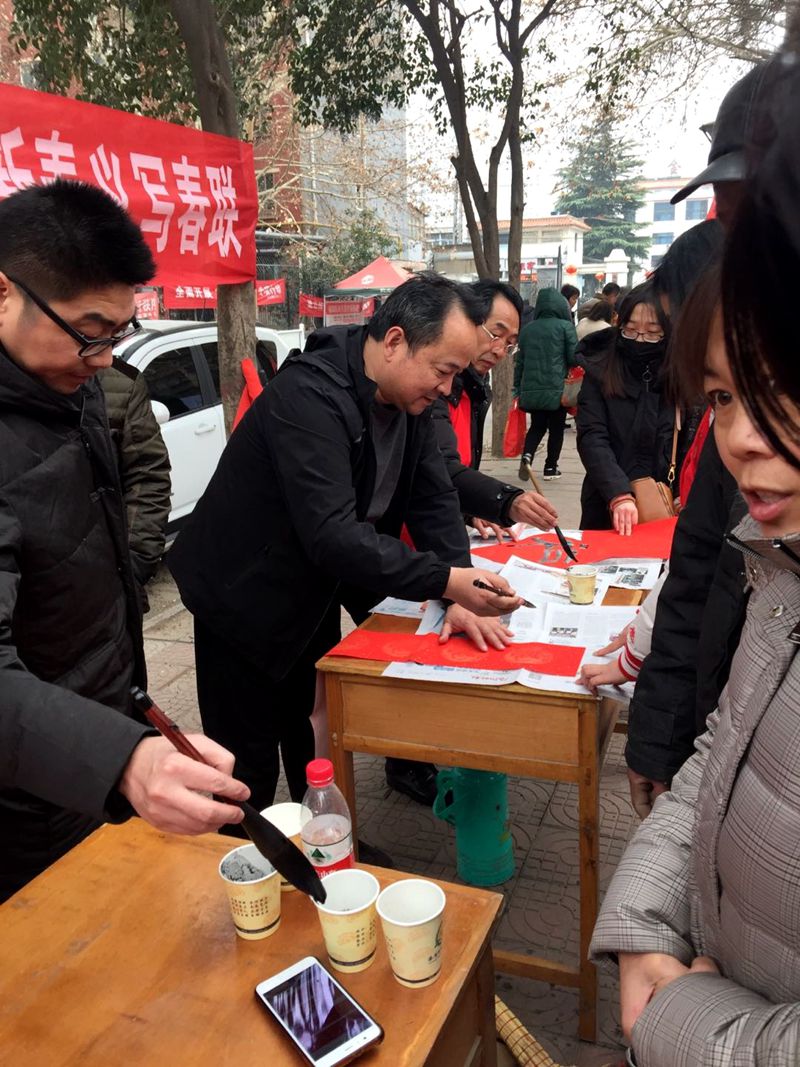 义务书写春联志愿服务队的老师们挥笔泼墨,用精辟的词句歌颂党的十八大以来祖国建设取得的成就,宣传党的十九大精神。严酷的寒冬,红彤彤的对联,社区群众们兴高采烈的挑选着春联,满意的笑容温暖了志愿者的心田。还有的群众请志愿者们书写自己心意的话语。从大家挑选春联内容来看,感谢党的惠民政策、祝愿祖国富强昌盛、向往美好生活、期盼幸福安康等内容居多,说明了群众对美好生活充满希望。