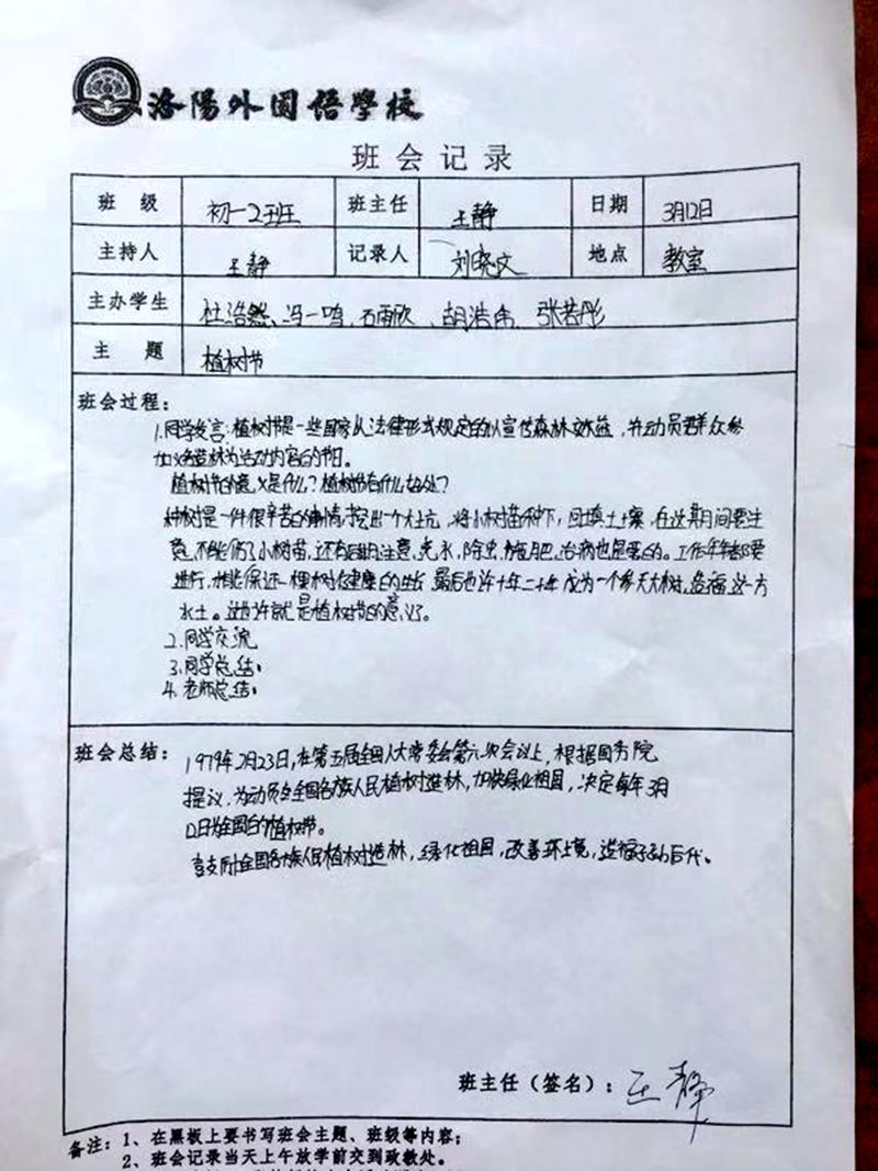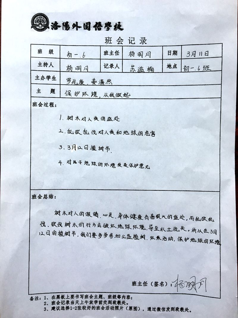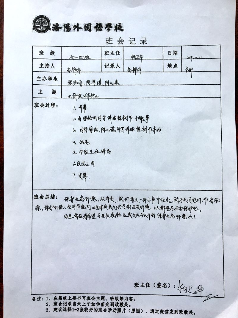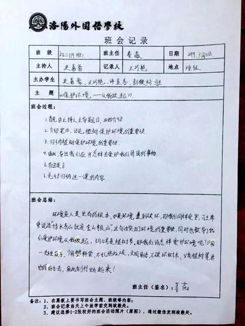 2019年3月12日第41个植树节到来之际,洛阳外国语学校东校区政教处以升旗仪式、主题班会为载体,组织开展环保宣传教育活动,倡导同学们积极响应国家号召,参加力所能及的植树节义务劳动;教育引导同学们增强环保意识,从我做起,从身边事做起,为改善生态环境出一份力。