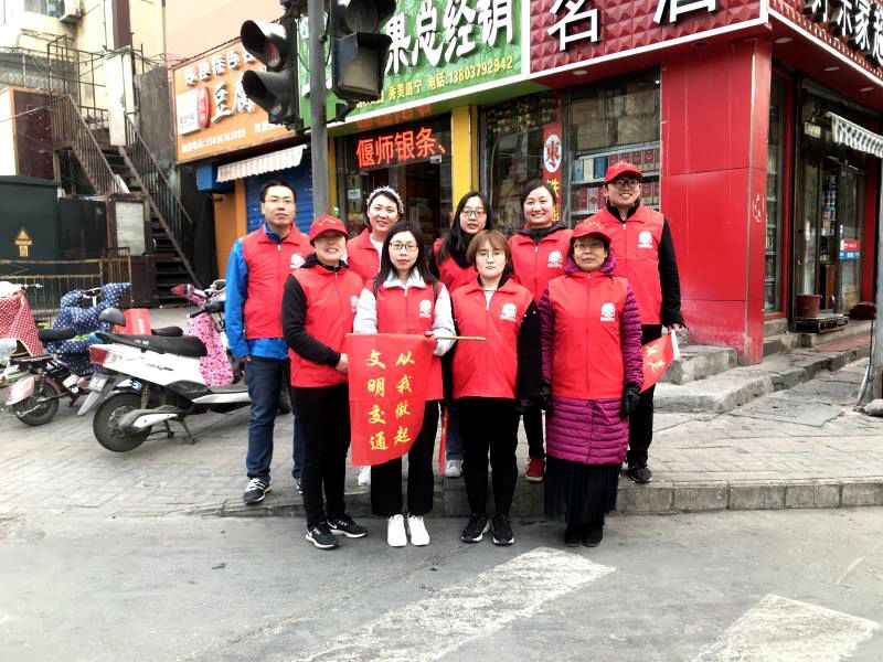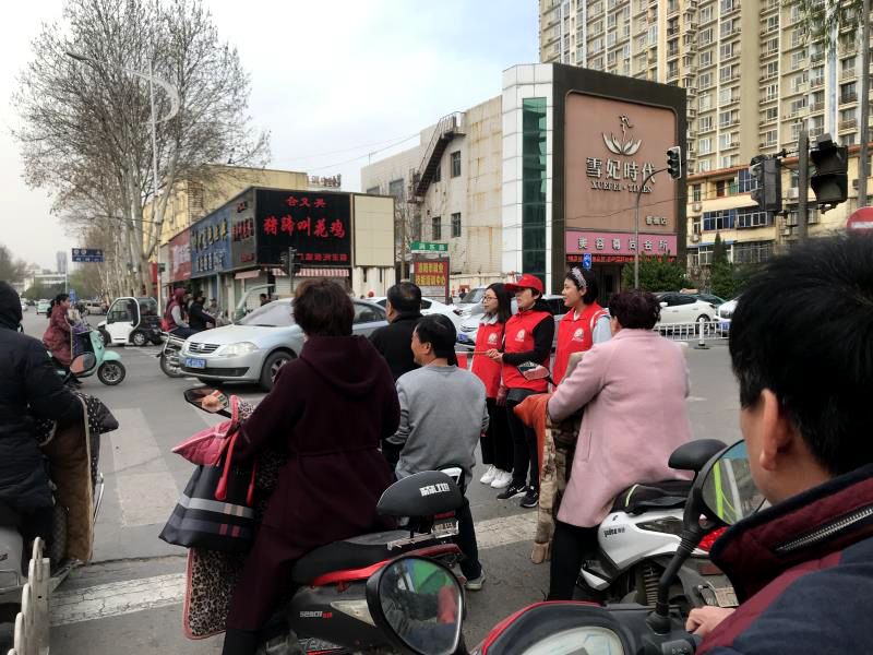 早上7:20焦文明、王慧丽两位队长率先到达服务地点,王巧凤、魏芳芳老师等8名志愿者统一身穿红色马甲,手持引导旗,分别在十字路口四个方向开展文明交通服务,提醒行人遵守交通规则,不闯红灯、不乱穿马路、文明骑车,向过往车辆和行人传递文明出行、安全出行理念。