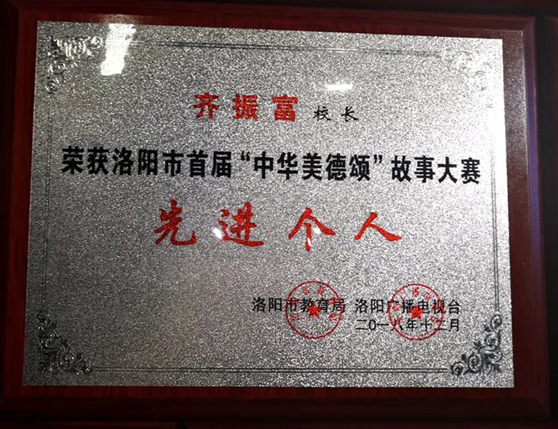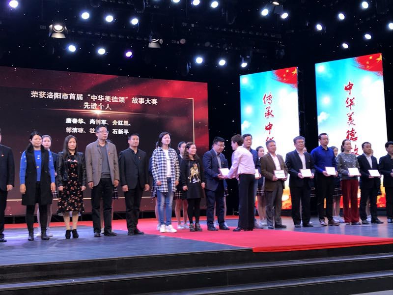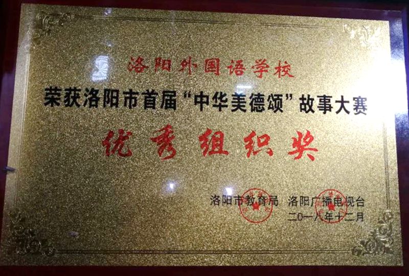 为了加快构建文化传承创新体系,大力营造全民阅读文化氛围,洛阳广播电视台、洛阳市教育局联合举办了2018年洛阳市首届“中华美德颂”故事大赛。2019年3月28日下午,洛阳电视台隆重举行洛阳市首届“中华美德颂”颁奖典礼,洛阳外国语学校作为协办单位全程参与其中,荣获“优秀组织奖”,同时荣获2018年度“中华美德颂教育基地单位”的称号;我校党委书记、校长齐振富同志荣获“中华美德颂”故事大赛“先进个人”的称号。