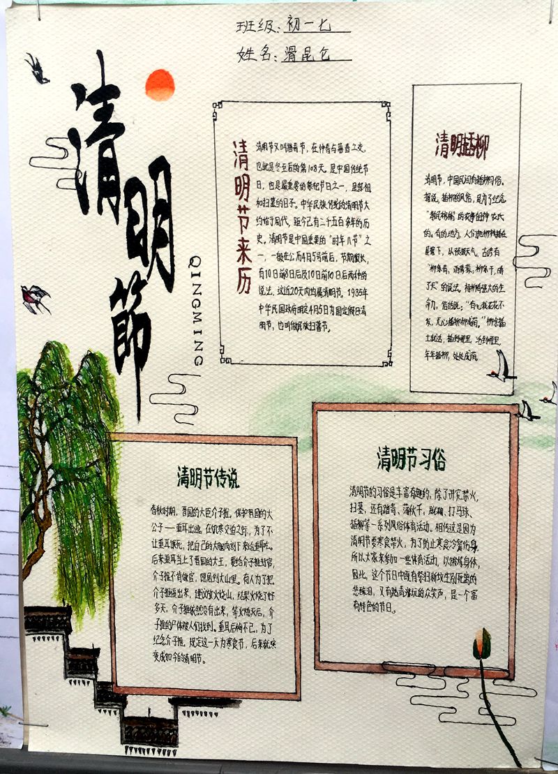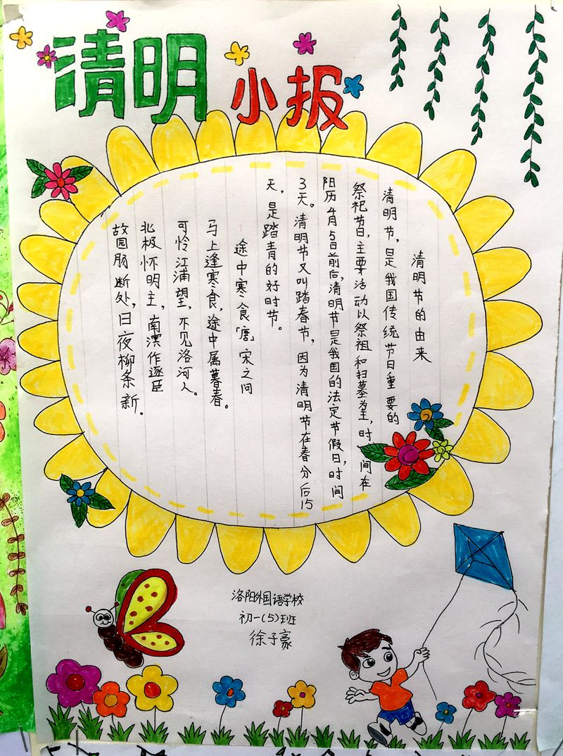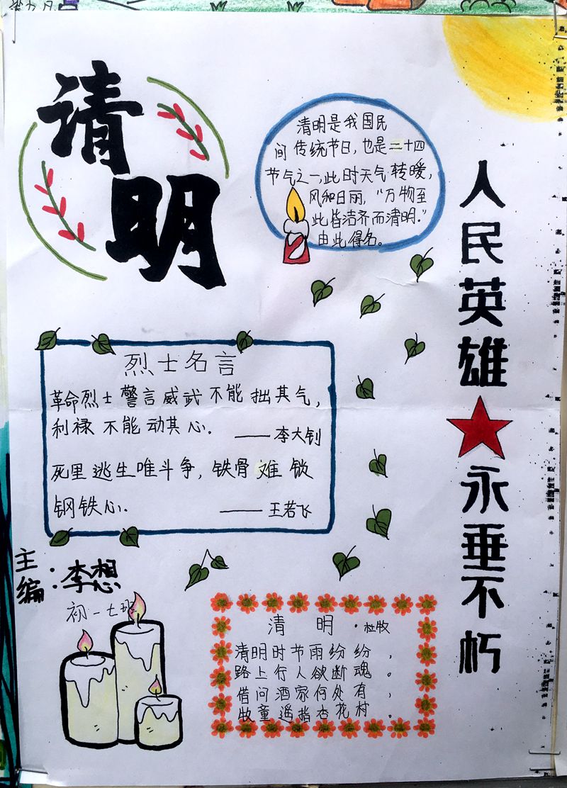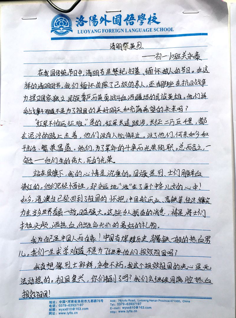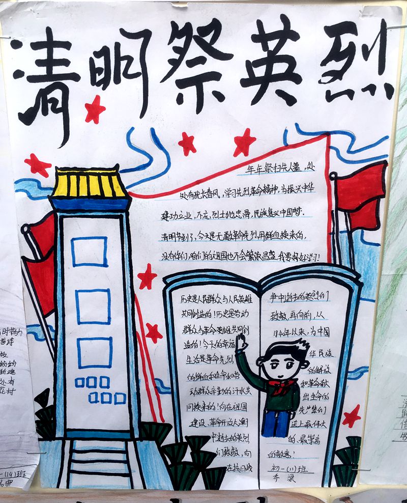 2019年4月5日清明节到来之际,洛阳外国语学校东校区政教处组织开展了“缅怀英烈,励志前行”主题活动。通过“国旗下演讲”“绘制手抄报”“优秀征文展评”等多种方式,以清明节纪念活动为契机,对学生进行中华传统文化教育、革命英雄主义教育、民族精神教育,提升学生的核心素养,激励同学们继承先烈遗志,弘扬民族精神,立志报国,奉献社会,争做新时代合格接班人。