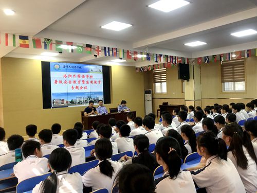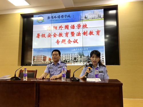 暑假到来,为了进一步增强学生的法制观念和安全意识,强化暑假安全教育管理,避免发生人身伤害事故,2019年7月5日下午,洛阳外国语学校(东校区)邀请洛阳市西工区派出所冀国彦警官、陈雅静警官到校为全体学生做安全与法制教育专题报告。报告会由政教主任韩昱主持。