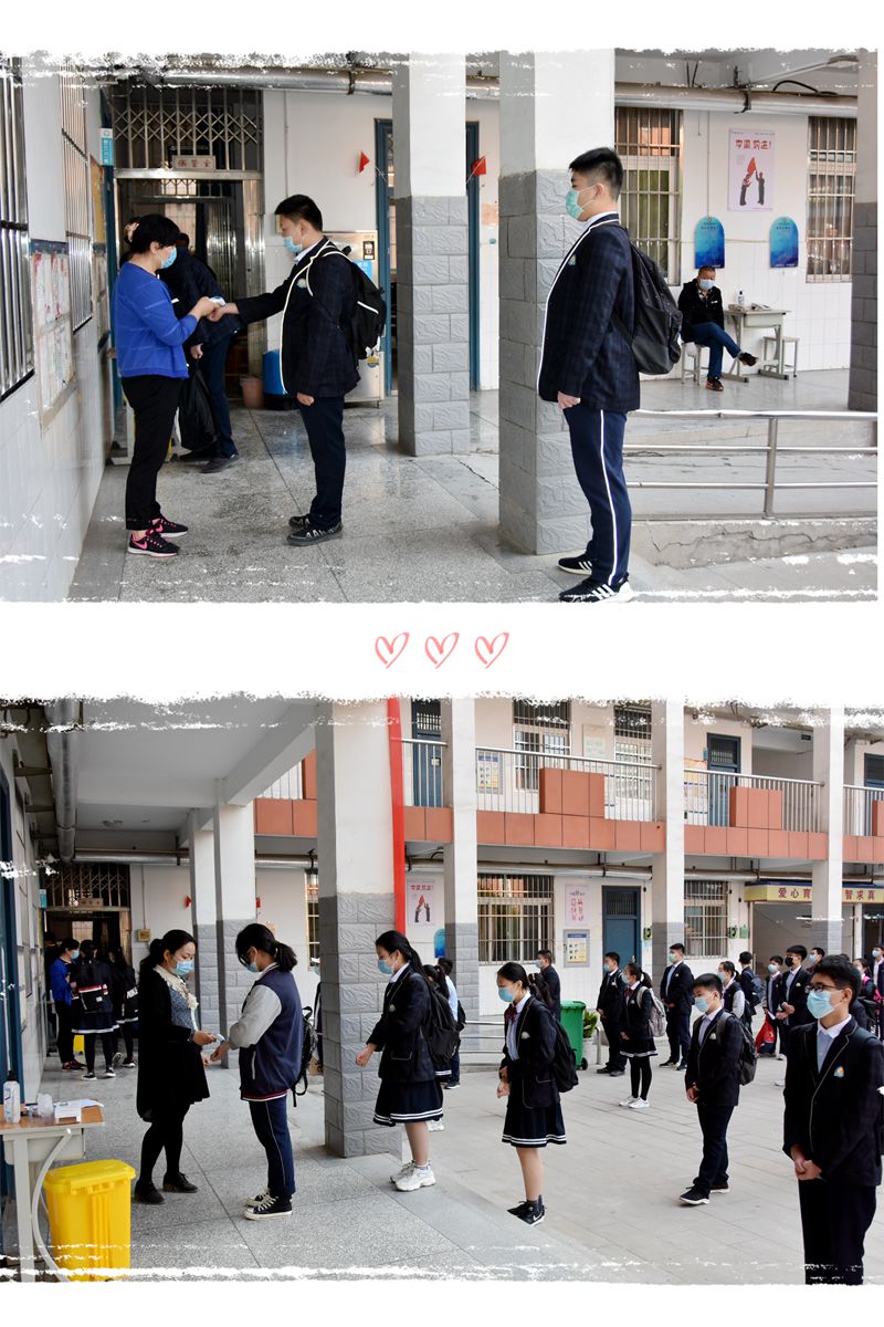 5月6号上午,初二年级学生首先返校,初一年级学生下午返校。上午从7:30开始,下午从14:00开始,初二、初一各班按照规定时间,错峰在学校东西两侧集结点集合。各班学生由班主任老师和配班老师带领,分两路纵队间隔1.5米排队行进。在学校门口,经过双手消毒,测量体温,提交身份(洛康码)验证、钉钉健康打卡登记表和承诺书后有序进入校园。学校门口还设有留观室和隔离室,如有同学体温异常,将在留观室进行复检,牢筑校门口的第一道防线。
