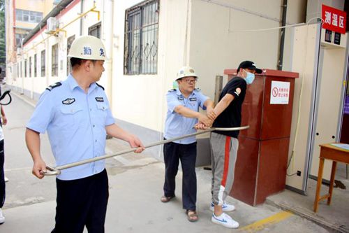 为了提升门卫对各种反恐器械的熟练使用,增强学校门卫保安人员对突发事件的应急反应能力和处置能力,政教处组织保安人员开展了例行反恐演练。演练模拟背景:在校门口发现一名不法分子,手持砍刀欲进入校园,门岗保安人员发现情况后迅速疏散师生,并将不法分子控制。
