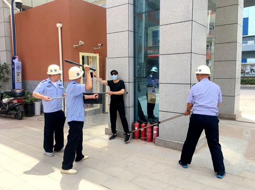 为了确保师生在校安全,提升学校保安人员的应急处置能力和反恐能力,学校进行了一场防恐防暴演练。演练中,一名“歹徒”正常登记进入校园,遇到校园内正在活动的学生,拿出手提袋内的斧子冲向学生。保安人员发现情况后,拿起反恐器械马上冲向“歹徒”,经过博斗合力制服“歹徒”,成功保护了学生安全。