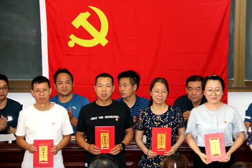 会议首先进行新党员入党宣誓、老党员重温入党誓词。全体党员在党旗下庄严宣誓,坚定如磐初心,铭记使命担当。党委委员、副校长胡伟民为孙楠、李磊、樊玉飞等三位新党员佩戴党徽,赠送政治学习书籍,并勉励他们加强政治理论学习,提高思想觉悟,坚定理想信念,不忘初心、牢记使命,做合格党员。