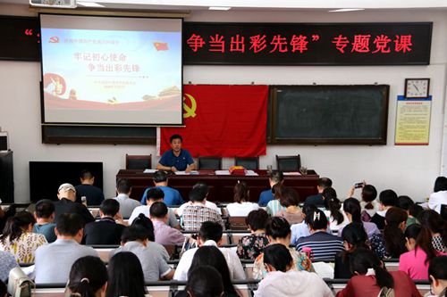 最后,党委委员、副校长魏成民上了“牢记初心使命,争当出彩先锋”专题党课。强调广大党员要在深入学习领会党的创新理论中筑牢信仰之基,在重温党的光辉历史和优良传统中补足精神之钙,牢固树立“四个意识”、坚定“四个自信”、做到“两个维护”。要在全面落实市委、市政府建设副中心、打造增长极的工作部署中发挥作用,创建与副中心城市相匹配的教育事业。号召党员同志们发挥先锋模范作用,斗志不消、干劲不减、激情不退、情怀不变,共同打造“精彩洛外、品牌洛外,辉煌洛外、幸福洛外”,在办好精彩的洛外教育中做出彩先锋。