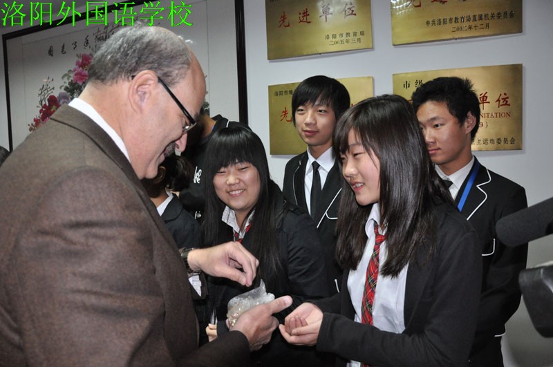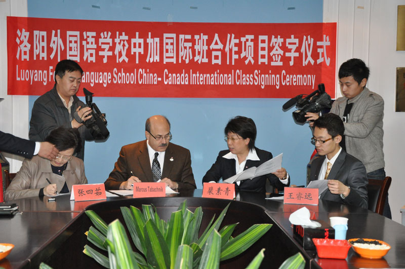 加拿大魁北克省莱斯特.比.皮尔逊教育委员会莱斯特主席一行于10月28日到洛阳外国语学校进行访问。他们对洛阳外国语学校中加国际班合作项目进行详细的考察,与中加国际班的高中学生亲切交谈,举行了合作办学项目认定签字仪式。洛阳市教育局党组书记、局长侯超英出席签字仪式,高度评价中加国际班合作项目,对洛阳外国学校裴素青校长富于创新和实践的精神给予高度赞扬。洛阳外国语学校于2010年设立国际部,广泛开展国际合作和交流,经省教育厅批准,加拿大魁北克省莱斯特.比.皮尔逊教育委员会认定,与其所属的蒙特利尔麦克唐纳高中建立官方合作,开办高中双学历国际高中班,该项目是中国和加拿大两国共同认定的高中学历教育。此次合作项目的签订不仅对我校打造外语特色、国际化窗口名校意义重大,也为我市中外合作办学开了个好头,从而为我市学生提供了国际交流的平台,为我市能够有更多的学生有机会通过此项目走进世界名校学习深造创造了条件。