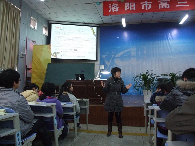 洛阳市高三年级英语二轮复习研讨会在我校科技综合楼举行,来自各县(市)区及各中学的英语教研组长、高三英语教师参加了会议。会议总结了高三一轮复习过程中取得的成绩与存在的不足,部署安排了二轮复习的有关工作要求,并进行了示范课展示。 图为全国英语优质课比赛一等奖、河南省英语优质课比赛第一名的洛阳外国语学校颛红娟老师在为全市教师做示范课。
