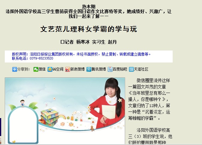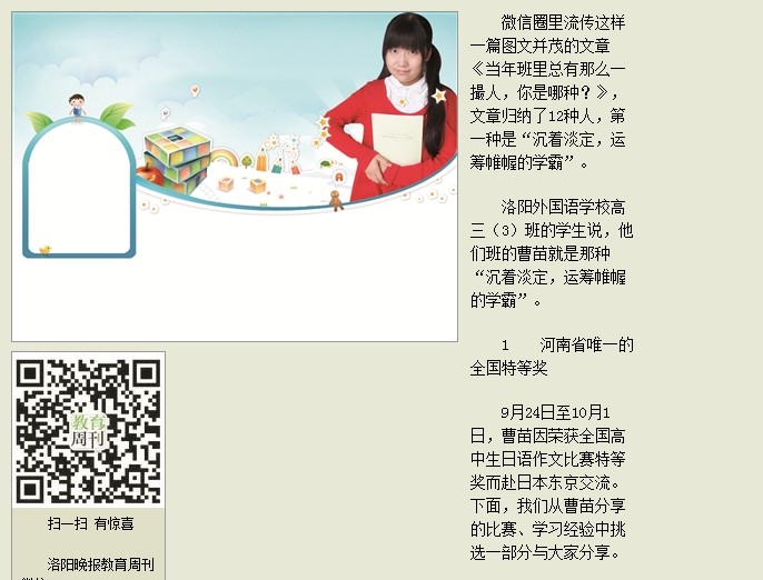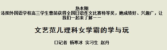 我校高三同学曹苗,在全国日语作文大赛中,荣获全国个人特等奖,也是河南省唯一的一个特等奖,因此取得了赴日本东京交流的宝贵机会。下面请看《洛阳晚报教育周刊》对曹苗同学的专题采访,希望同学们能够从中分享曹苗同学的学习经验和比赛技巧。