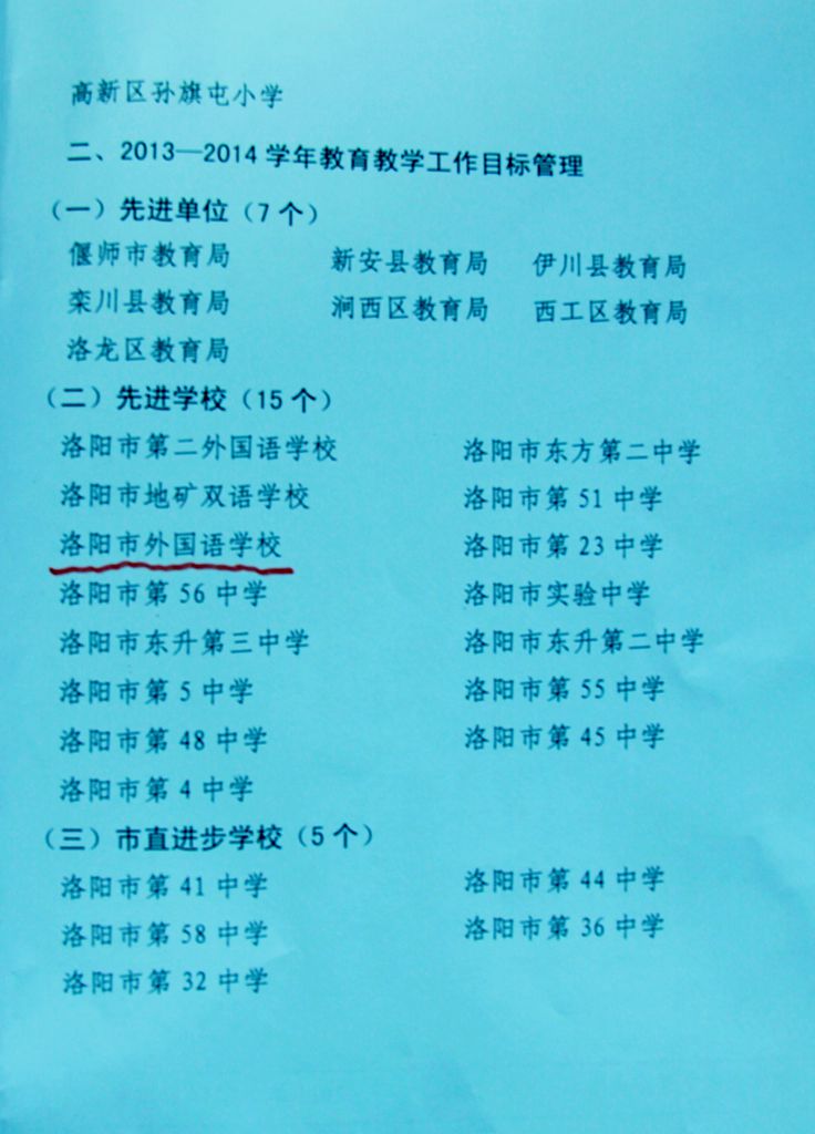 2013--2014学年,洛阳外国语学校领导班子致力于建设一支团结奋进、能打硬仗的教师团队,在领导班子的带领下,经过洛外全体师生的不懈努力、共同奋斗,取得了辉煌的成绩。