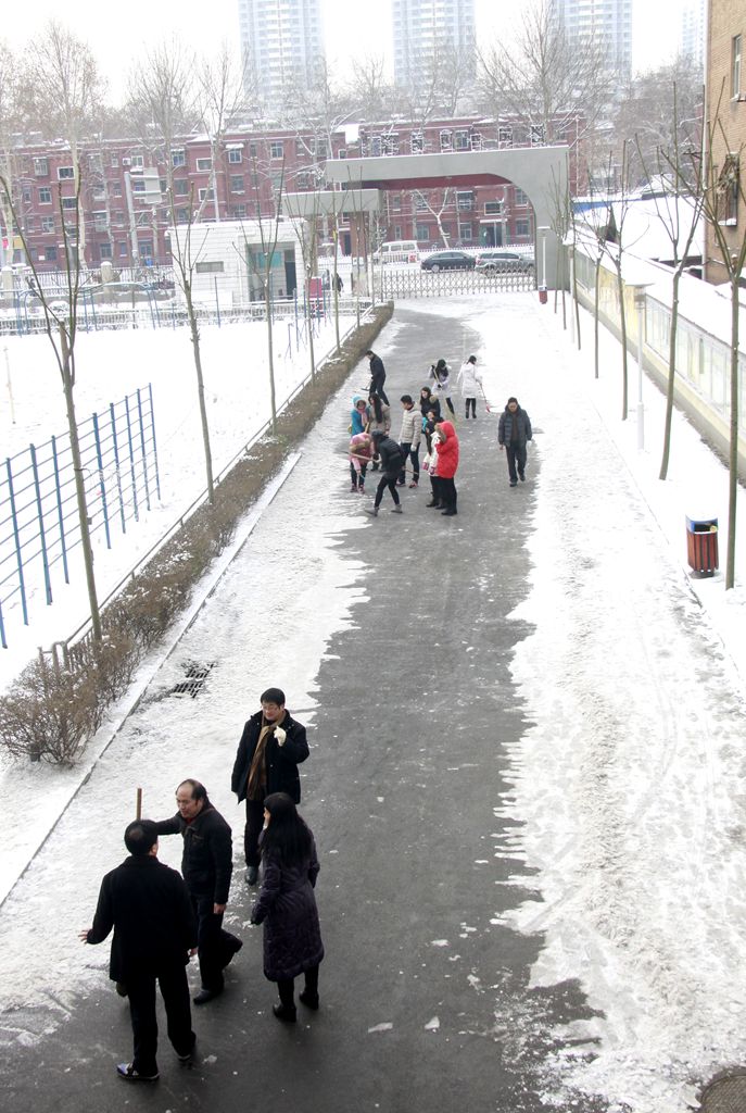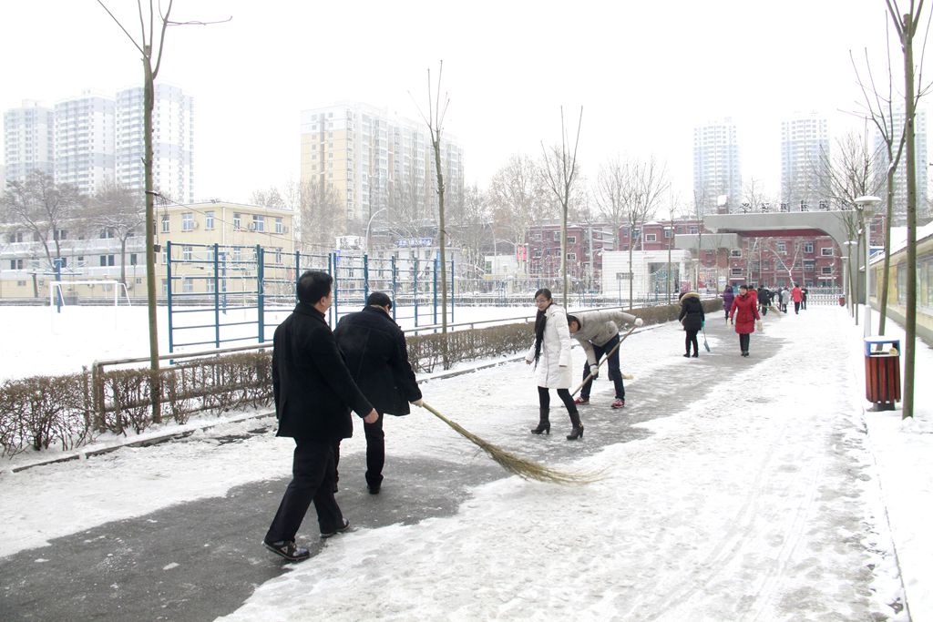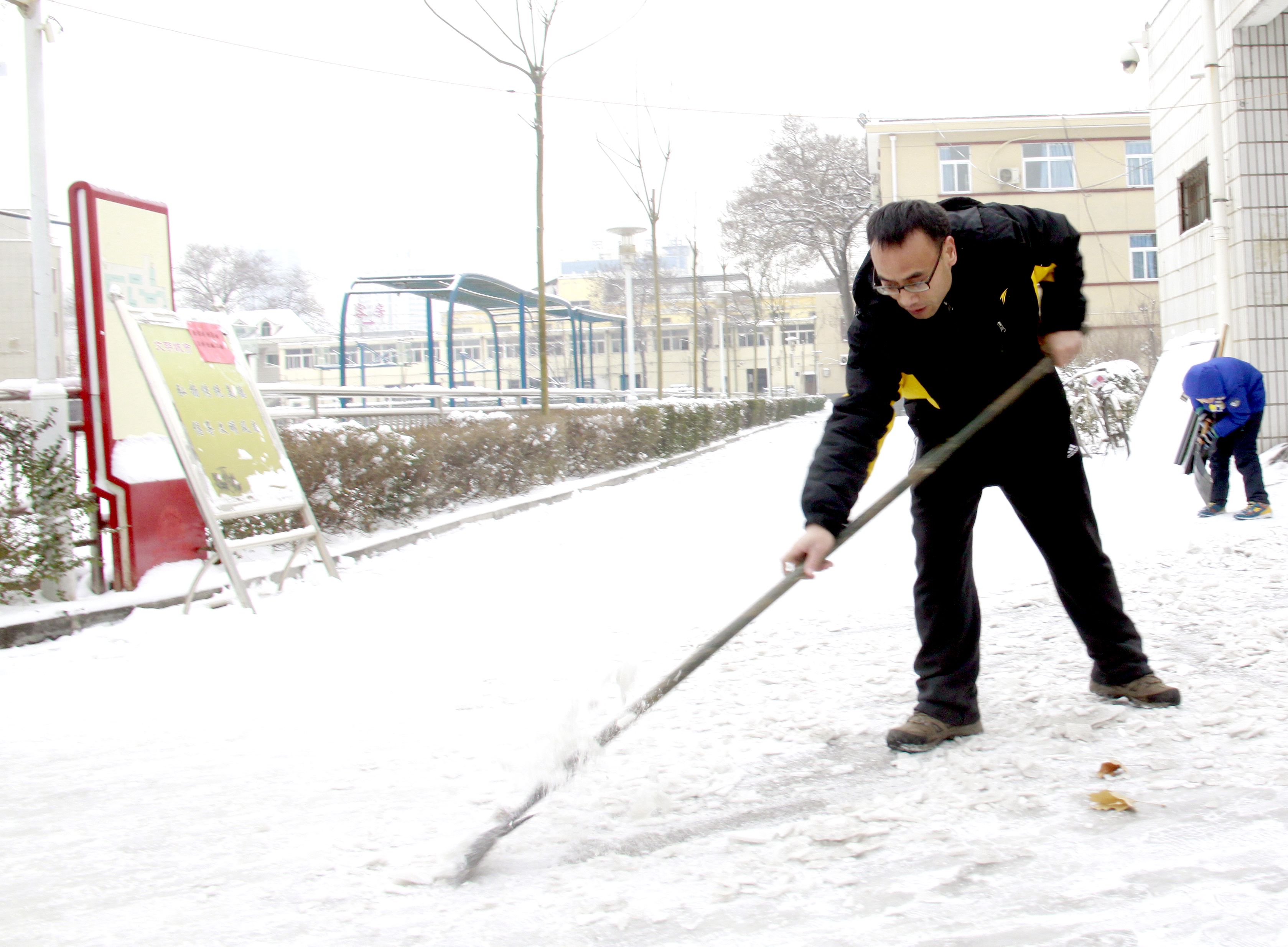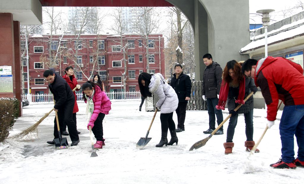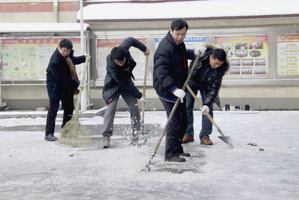 一场久违的雪,给大家带来了不小的惊喜,但大雪过后,结冰的路面给师生带来了不小的安全隐患,今天早上上班之后,学校领导为了消除因结冰带来的安全隐患,发出倡议,号召中层以上领导及没有课的老师,参加义务劳动,清扫积雪,领导及老师数十人收到短信之后,陆陆续续赶到现场,纷纷拿起铁锨、扫帚,投入到义务劳动中。天虽然很冷,但大家铲的铲,扫的扫,干的热火朝天,经过一个多小时开心的劳动,从校门口到校园,以及通往办公楼、科技路、厕所等处,分别清出一条条安全通道,保障了师生的安全。
