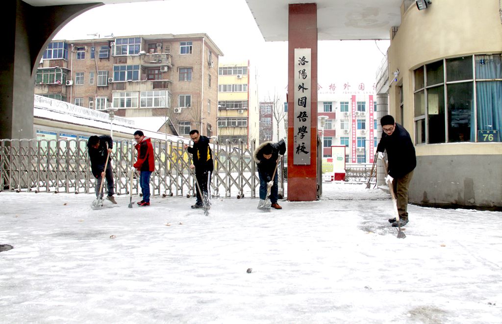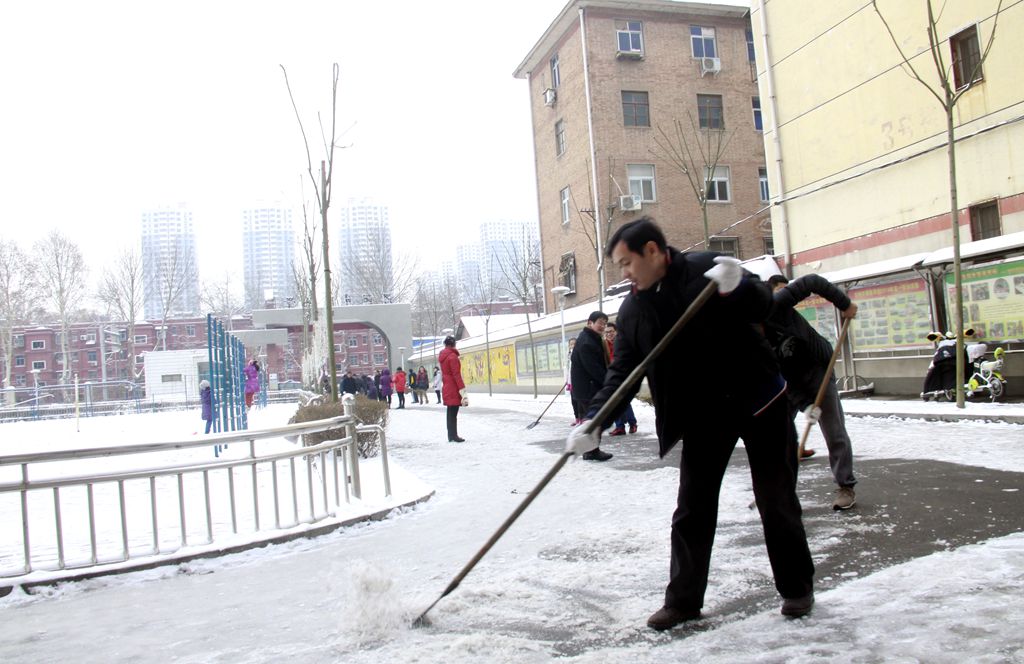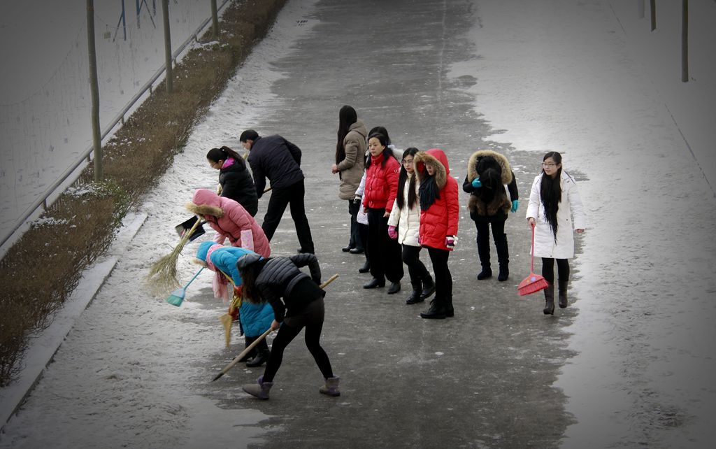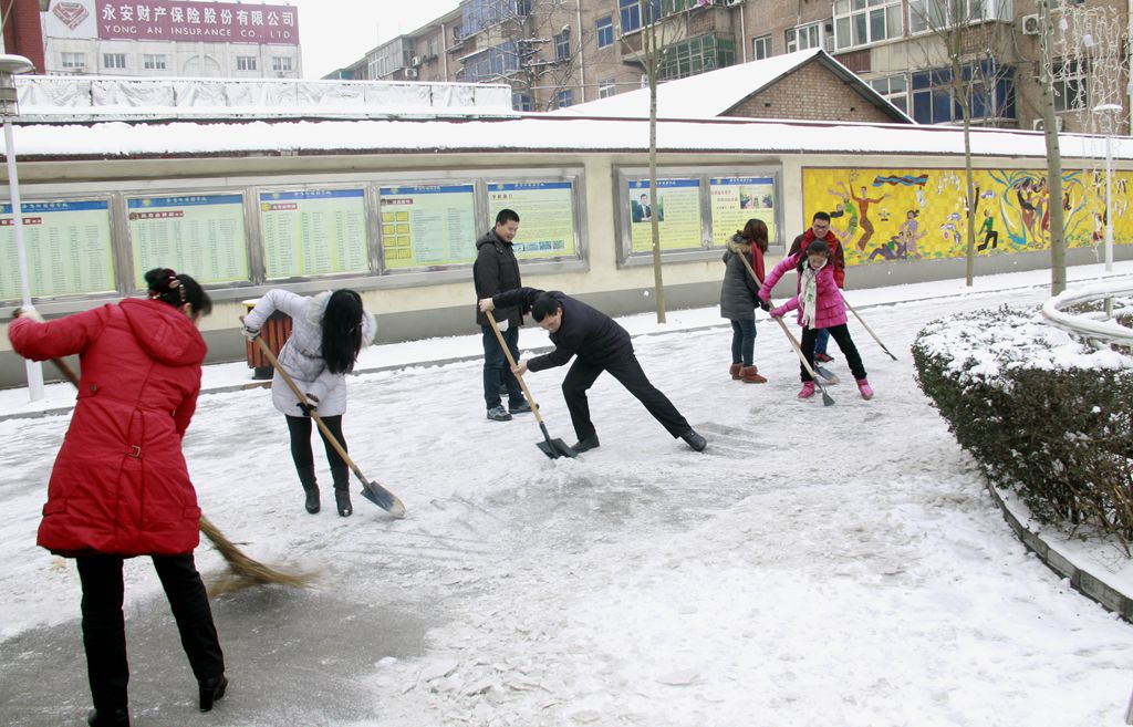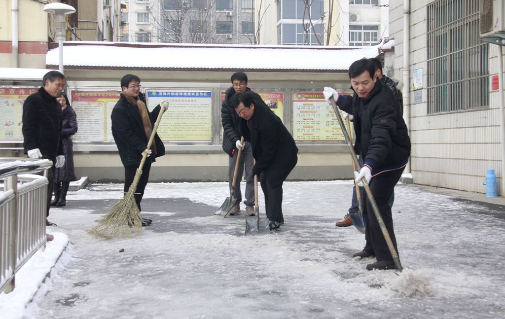 一场久违的雪,给大家带来了不小的惊喜,但大雪过后,结冰的路面给师生带来了不小的安全隐患,今天早上上班之后,学校领导为了消除因结冰带来的安全隐患,发出倡议,号召中层以上领导及没有课的老师,参加义务劳动,清扫积雪,领导及老师数十人收到短信之后,陆陆续续赶到现场,纷纷拿起铁锨、扫帚,投入到义务劳动中。天虽然很冷,但大家铲的铲,扫的扫,干的热火朝天,经过一个多小时开心的劳动,从校门口到校园,以及通往办公楼、科技路、厕所等处,分别清出一条条安全通道,保障了师生的安全。