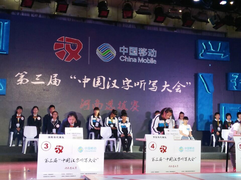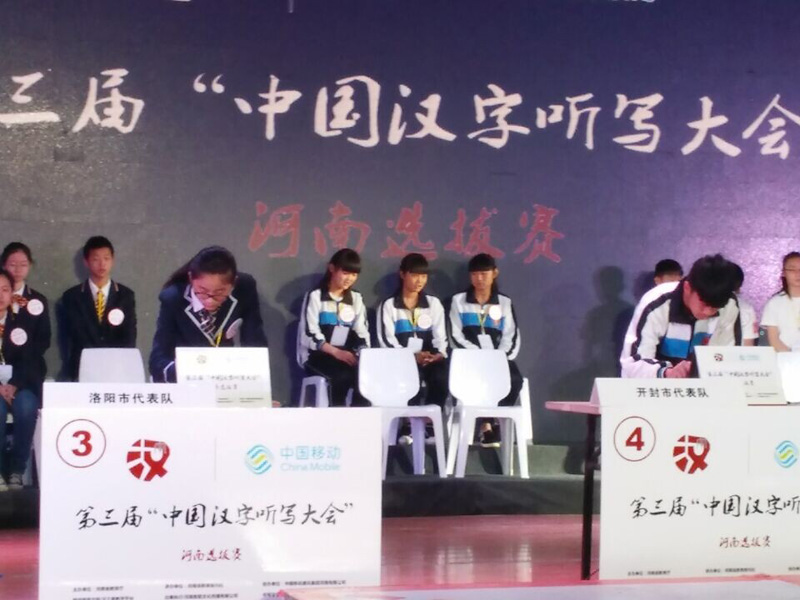 2015年5月11号,我校洛阳外国语学校初二(10)班学生赵柯与东升二中、洛阳第二外语学校和嵩县实验中学的选手,共同组成“洛阳市代表队”,参加“第三届中国汉字听写大会河南选拔赛”,其余六支代表团分别是许昌、漯河、开封、汝州、长垣和安阳代表团。