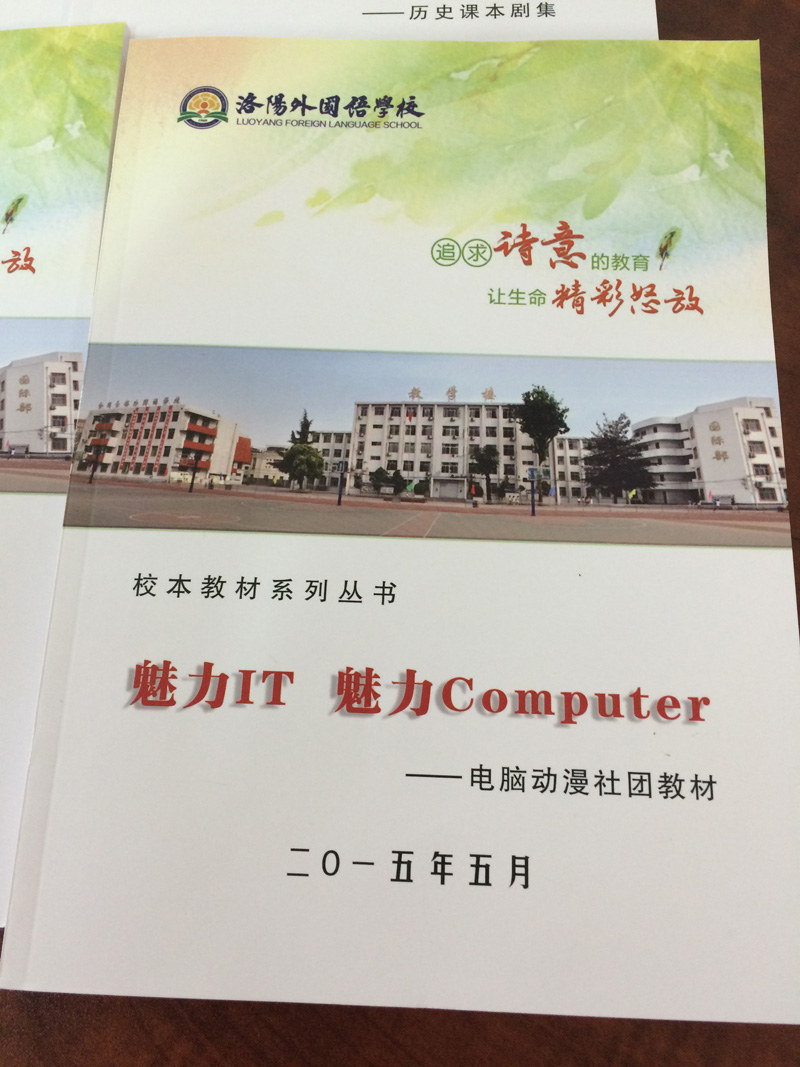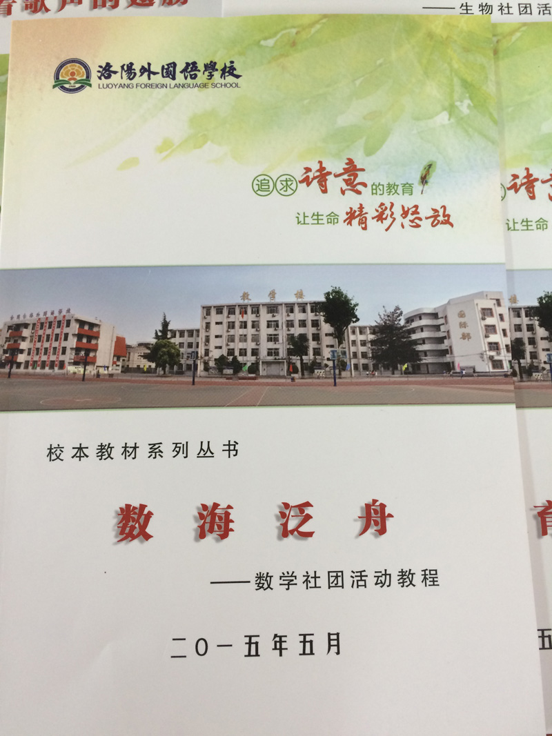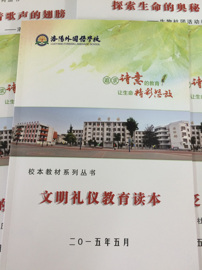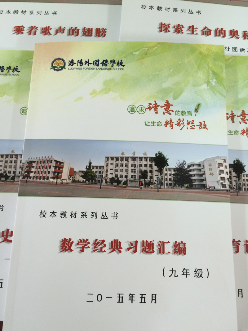 随之,成立了洛阳外国语学校校本教程(义务教育阶段)编委会,由段华松校长担任总编辑,副校长胡伟民、钟保强,校长助理路红老师担任主编,责任编辑有吴进州、王秋堂、张利平、苑新国、郭长庆、王军霞、袁峰、宋云凤、岳芫、刘新立、胡建娜、王长云、王海燕、焦晓菲、姚维华、蒋素红、方心、徐淑唏、孟紫千、尤丽、唐红丽、樊晓丽、寇志红、仝瑜、毕海、梅文川、吕琳、张莉、胡银等。为满足学期课程设置和各社团需求,围绕社团活动开发校本课程系列丛书。组织开发了声乐社团的教程《乘着歌声的翅膀》、编辑:孟紫千、尤丽、底红霞;数学学科的《数海泛舟》、编辑:方心、姬翔、祁婧;7、8、9年级三册《数学典型例题汇编》,7年级编辑:方心、宋红霞、郭月霞、张宇、王秋菊、聂晓青、姬翔、祁婧、王天宇;8年级编辑:宋云风、赵怀庆、王桂玲、郭金红、孙旭辉、刘丹凤、张静、史楠楠;9年级编辑:梅文川、田东芝、张伟杰、刘富娟、董云伟、杨智聪、石惠娟;思品组的《文明礼仪教育读本》,编辑:胡建娜;文学戏剧社团教程《读出生命的韵律》,编辑:路红、蒋素红、张奇;电脑动漫社团教程《魅力IT 魅力Computer》,编辑:焦晓菲、李雪云、丁晓华、韩昱;生物社团活动教程《探索生命的奥秘》,编辑:贾红芹;地理社团的《美丽的洛阳》,编辑:孟紫千;英语社团的《中学生英语口语交际必备手册》,编辑:苑新国、杨柳青、刘海利、常培培、宫洁婷、张雅梅、陈凤英、陈浩佳、汤晓晓、郭笑岭、朱树芬、苗静然、李延军;历史社团的课本剧集《感受历史的脉搏》,编辑:徐淑唏。共计12种校本教程。除此之外,现仍有数本校本教程正在编辑开发中。在刚刚结束的星级评估活动中,我校的校本课程研发成果得到市教育局星级评估视导专家的充分肯定。