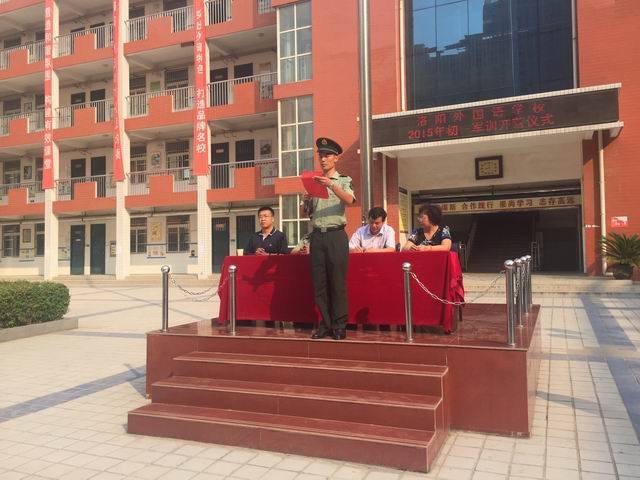 828日上午,在洛阳外国语学校东校区,学校为初一年级学生举行了隆重的军训开营仪式,段华松校长、胡伟民副校长、路红校长助理出席,段校长亲自给初一新生进行军训动员,并提出殷切的期望,要求学生在军训期间严格训练、严守纪律,通过军训能养成良好的习惯,并够做到“两不”、“三会”即不迟到、不带零食进校,会早读午读、会有序上下楼、会站行跑。开营仪式结束后,初一年级全体学生穿着整齐的校服,在教官的带领下开始了辛苦而愉快的军训生活。
