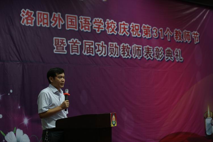典礼第一项全体起立,奏唱国歌。在热烈的掌声中段华松校长登台致词。段校长的讲话,饱含深情,既有对功勋教师的热烈祝贺,又有对全体辛勤付出的老师们的节日祝福,还有对学校发展的宏图展望,为我们洛外今后努力和奋斗指明了方向。