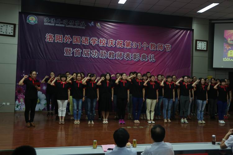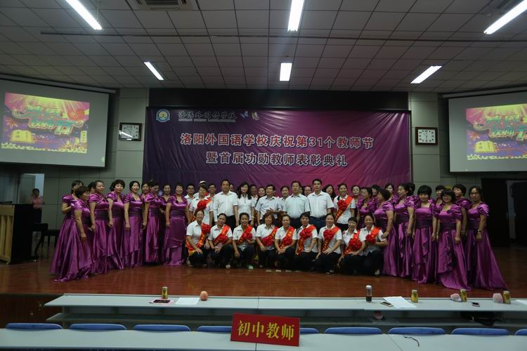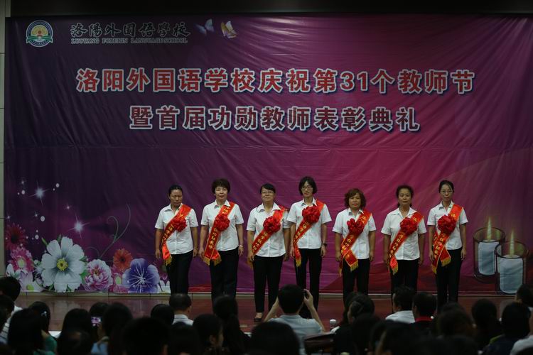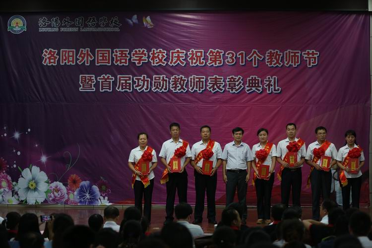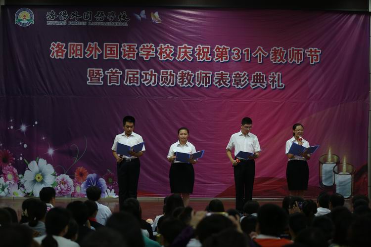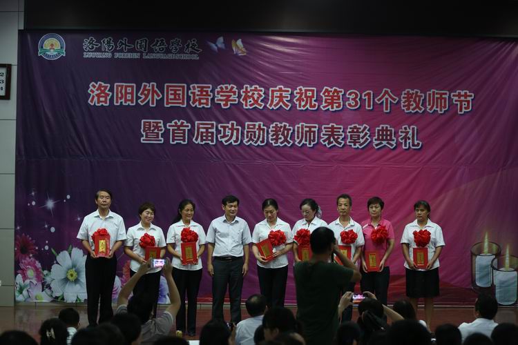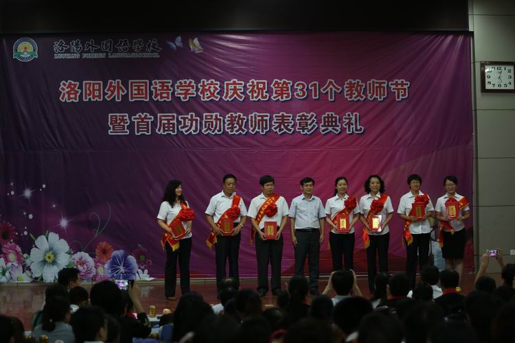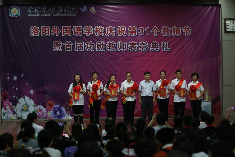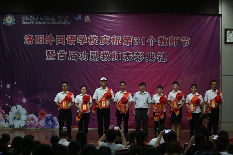 【校园新闻】 秋风送爽,丹桂飘香。在全国人民热烈庆祝抗日战争胜利70周年的日子里,第31个教师节带着秋的神韵款款向我们走来。2015年9月10 日下午4:30,我校隆重举行庆祝第31个教师节暨洛阳外国语学校首届功勋教师表彰典礼。在欢快的欢迎曲中,学校领导、初高中全体教师、学生家长代表、优秀学生代表步入科技楼表彰典礼会场。