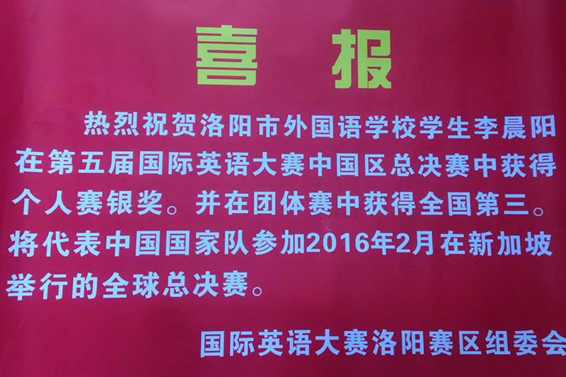 洛阳外国语学校学生李晨阳在2015年第五届国际英语大赛中国区总决赛中发挥出色、成绩优异,荣获个人赛银奖、团体赛全国第三名的好成绩,并将代表中国国家队参加20162月在新加坡举行的全球总决赛。