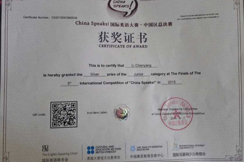 洛阳外国语学校李晨阳荣获第五届国际英语大赛中国区总决赛银奖