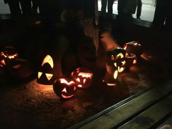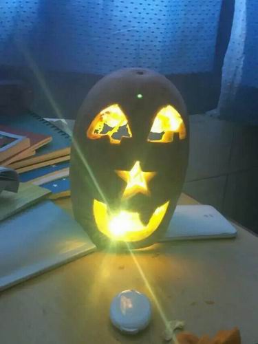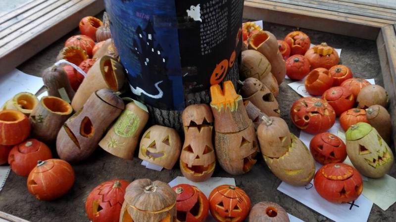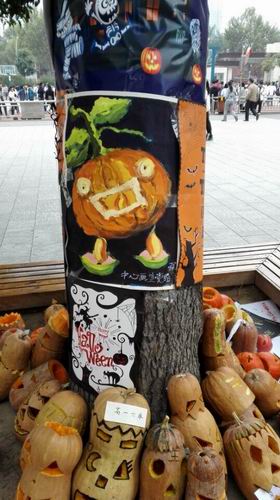 最激动人心的时刻到来啦:在教学楼门口的大树下,同学们用海报把大树妆扮成了万圣节之树,然后各班把各种创意的南瓜灯集中展出,傍晚时分则由宣传部的同学们点上蜡烛把所有的南瓜灯点亮,成为一道亮丽的风景!
