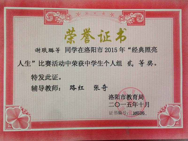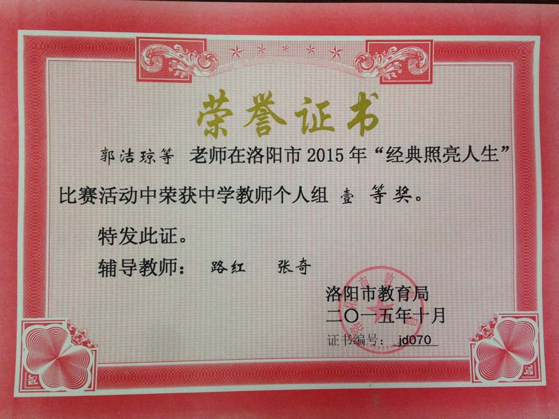 在洛阳市教育局组织的2015年“经典照亮人生”朗诵比赛中,洛阳外国语学校教师郭洁琼、张奇、王雪锦三位老师荣获中学教师组一等奖;谢琰璐、张世博、吕知伦同学荣获中学生组二等奖。特向指导教师路红、张奇表示祝贺和感谢。通过参加比赛和交流,展示了我校师生扎实的诗文朗诵功底和朝气蓬勃的精神面貌,提升了我校青年教师的专业朗诵水平。我校将以此次朗诵活动为载体,引导广大师生传承中华传统文化、弘扬华夏文明,让民族文化的精髓深入人心。