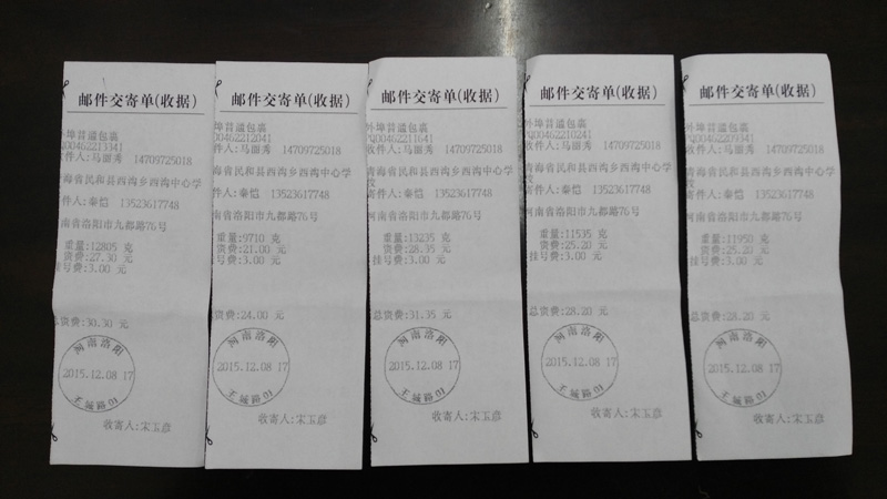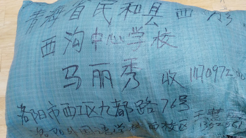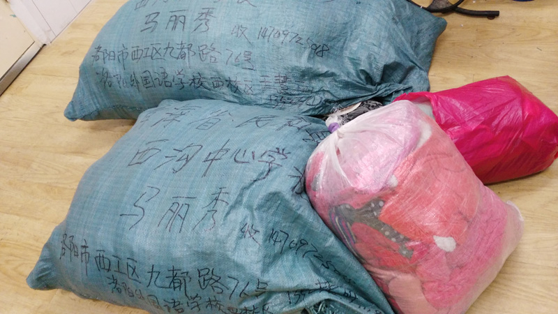 之后的几天里,每天都有学生拎着大包小包的衣服送到我们的办公室。王慧丽老师买来编织袋,王鹏、党翠翠、于雯民老师一起帮忙装好,第一次装了满满五包,秦恺老师开着车送到了邮局。五包衣物载着我们的心意向青海传递。之后,仍有学生源源不断的送来衣物,第二批、第三批、新的包裹整装待发,衣服鞋子前后共计千余件。